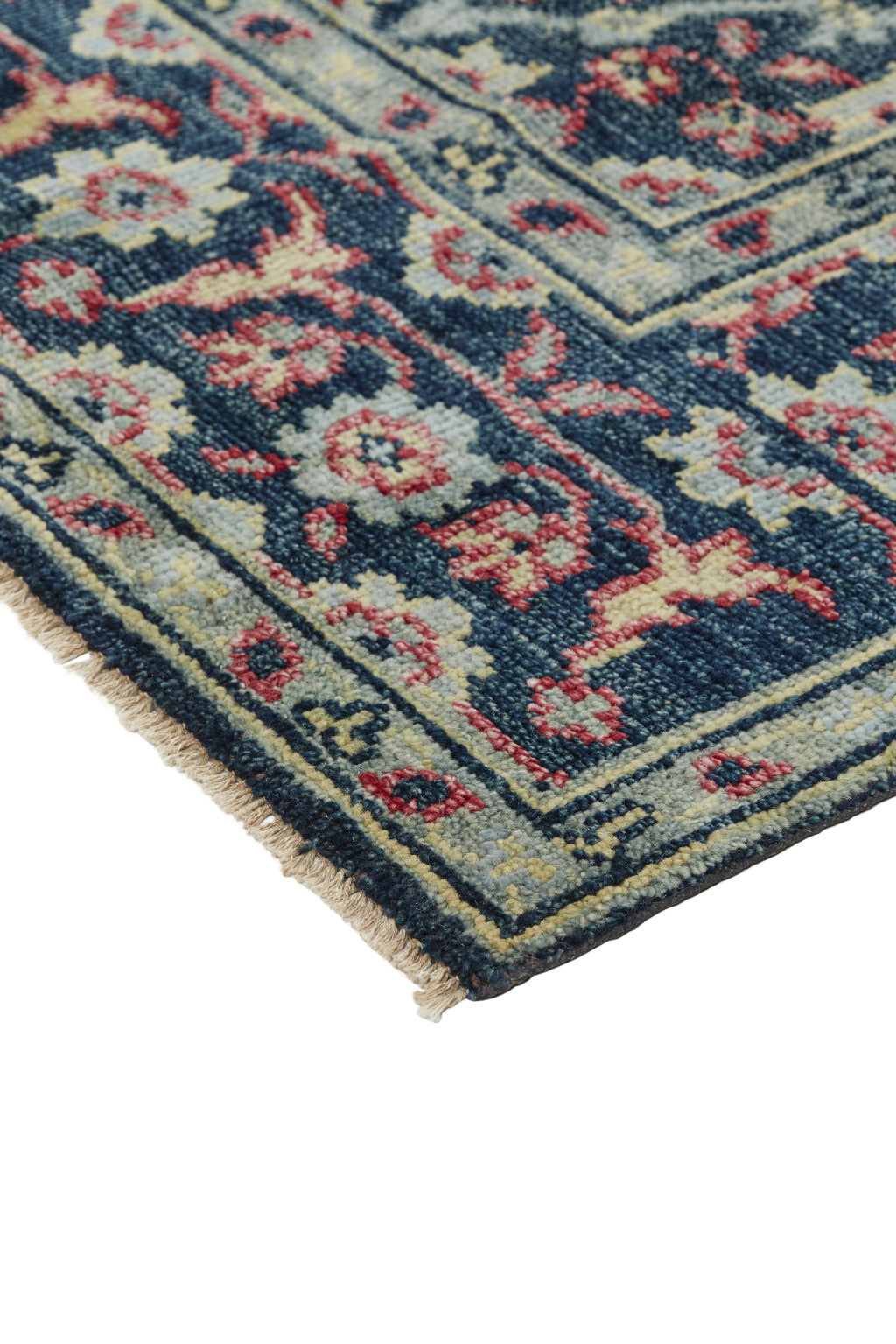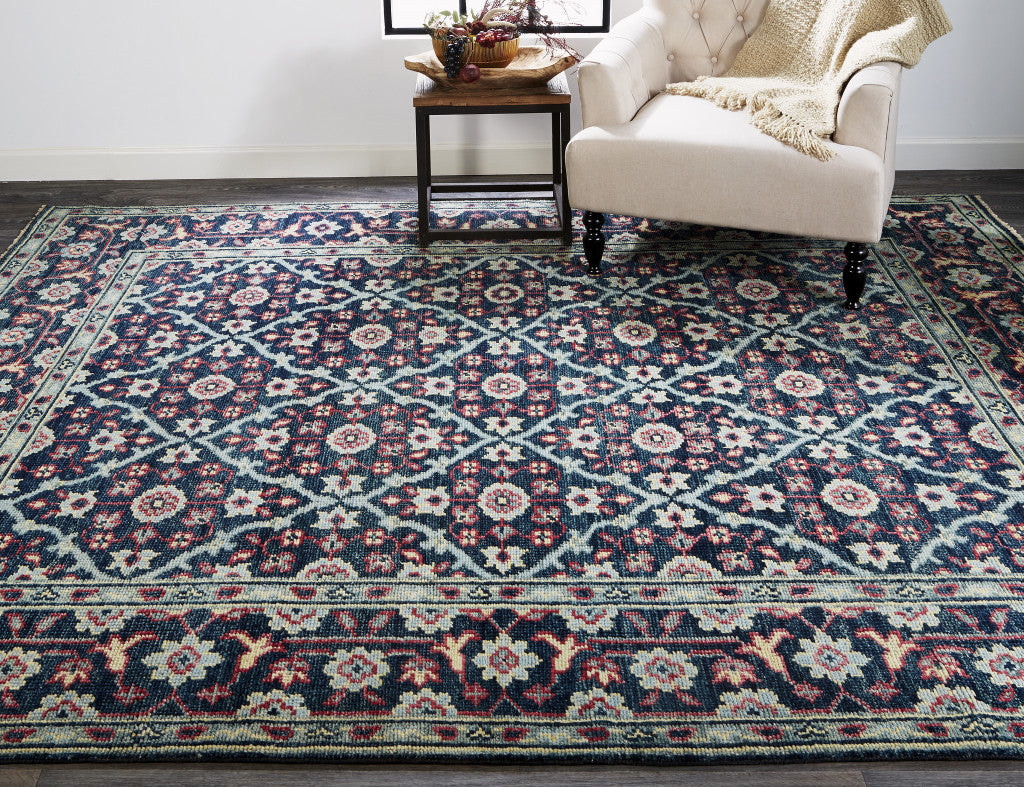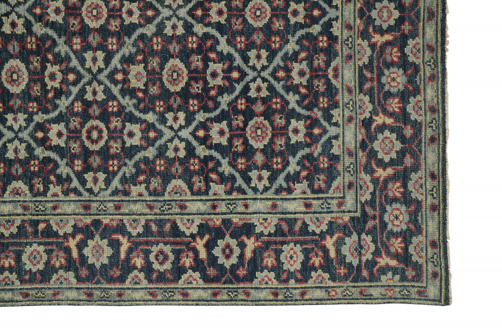 Set an inviting tone in your space with this 8' x 10' blue green and red wool floral hand knotted distressed stain resistant area rug with fringe. This rectangle shaped rug features a floral design in blue green and red to give it visual interest. A classic shape marries with good looking design for your space Ideal for spaces with kids and pets, this rug is stain resistant to help repel stains and spilled liquids. Tassel ends bring a timeless and fashionable look to your interior. Crafted by skilled artisans, this hand knotted rug is genuine and unique. No two will be exactly alike. Area Rugs help to give warmth and sense of home to your space. 0.28" H x 93" W x 117" D