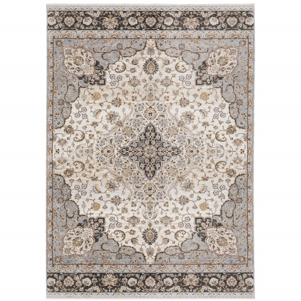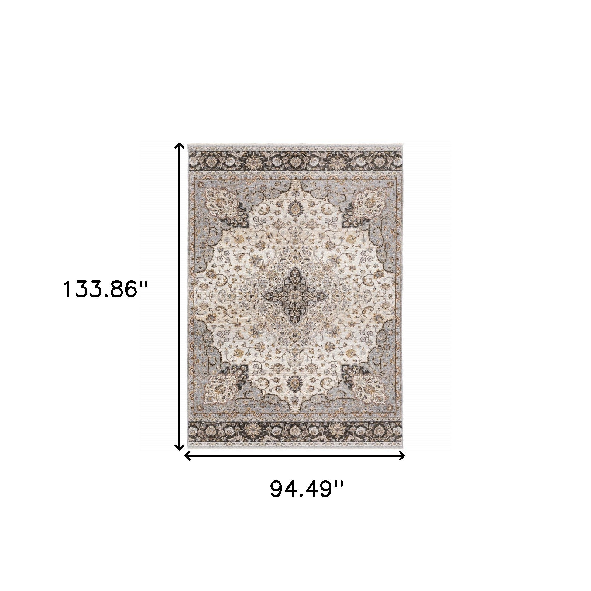 8' X 11' Ivory And Blue Oriental Power Loom Stain Resistant Area Rug With Fringe