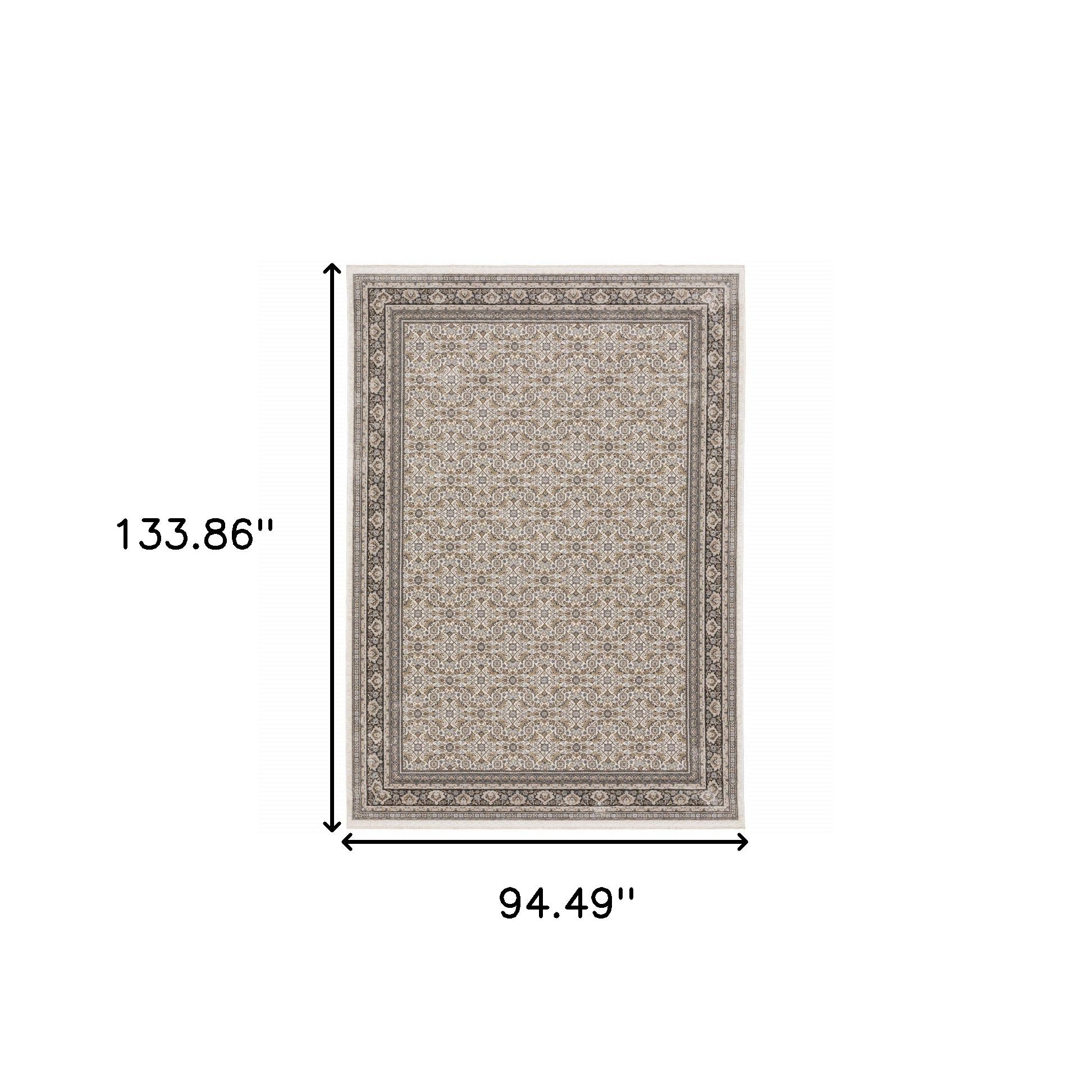 This 8' x 11' ivory and grey oriental power loom stain resistant area rug with fringe, is a great way to add warmth to a room. This rectangle shaped rug features a oriental design in ivory and grey to give it visual interest. A classic shape marries with good looking design for your space Ideal for spaces with kids and pets, this rug is stain resistant to help repel stains and spilled liquids. Tassel ends bring a timeless and fashionable look to your interior. Place this area rug against a hardwood or tile floor and it will enliven your living space with style and sophistication. 0.23" H x 94.49" W x 133.86" D