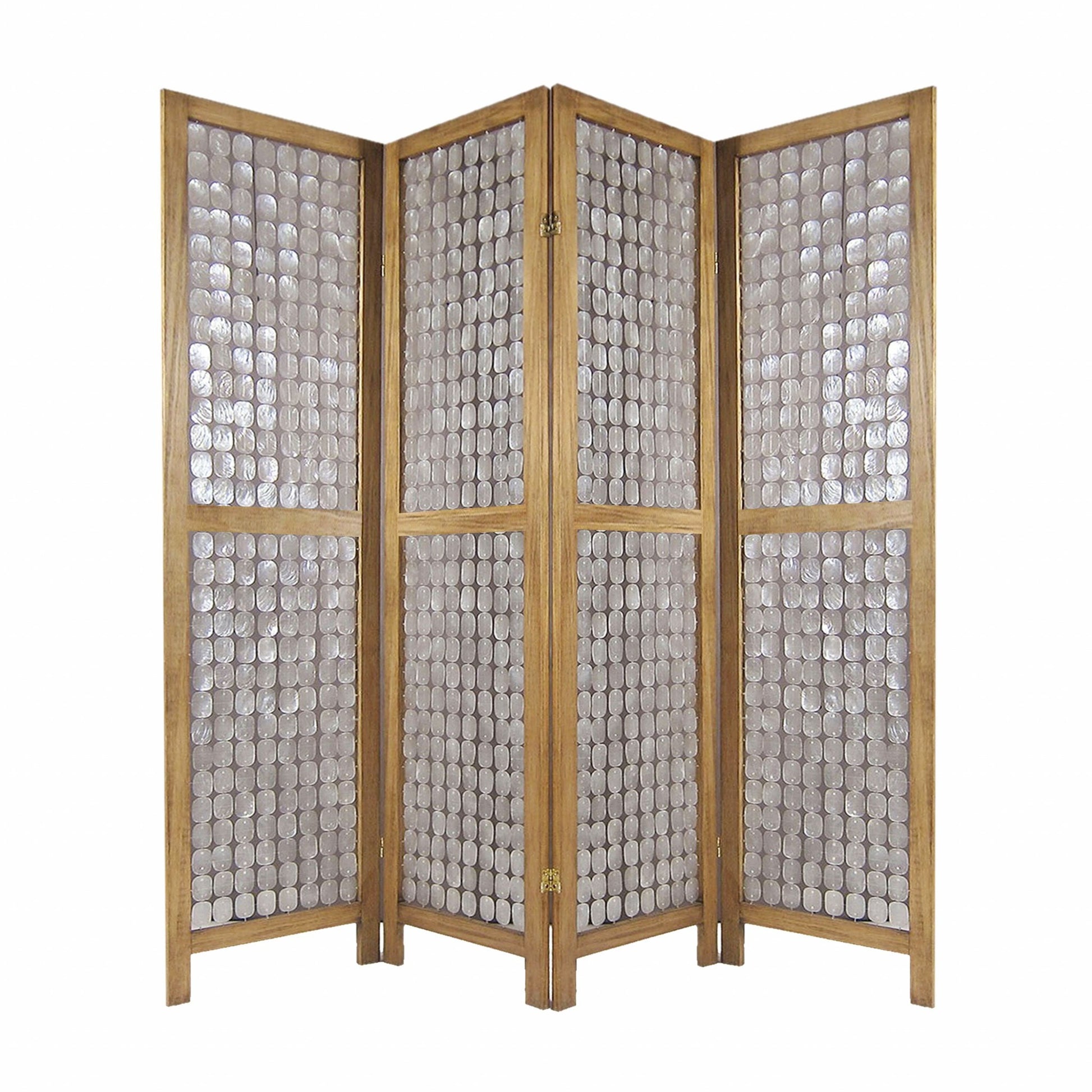 screen room dividers just got more alluring with this sensational princessa screen. it features a sturdy mango hardwood frame, polished in fine sandy brown. it is skillfully handcrafted with exact precision using stunning strands of processed capiz mother of pearl shells to get a superlative quality. each of the shells singly undergo thorough cleansing, polishing, coating and construction. the finished product is a classy home decor accent that suits your taste. to crown it all, a sparkling crystal clear pattern on both ends of the screen gives it a flawless finish. available in the size of 84 by 1.5 by 84 inches.