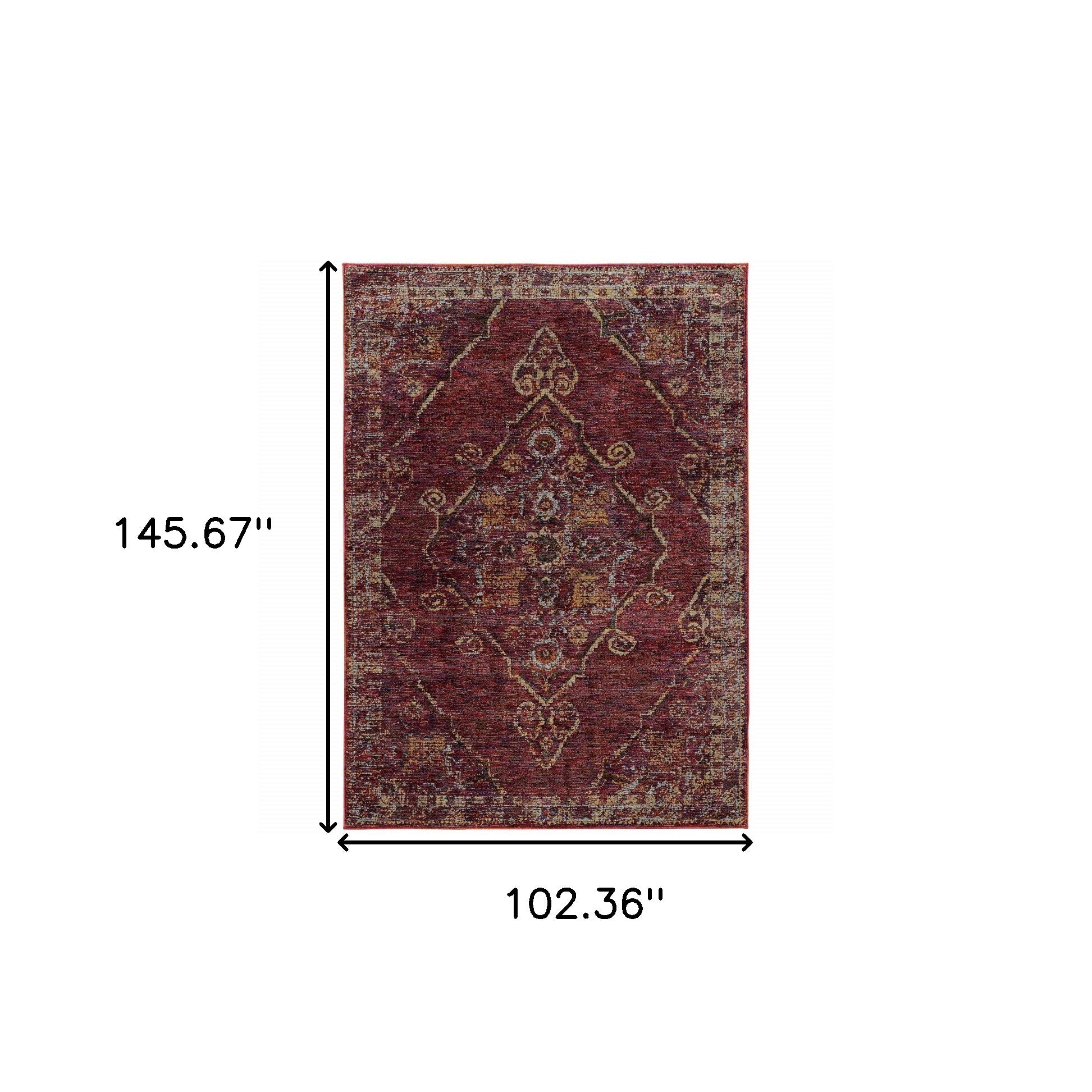 Set an inviting tone in your space with this 9' x 12' red and gold oriental power loom stain resistant area rug. This rectangle shaped rug features a oriental design in red and gold to give it visual interest. A classic shape marries with good looking design for your space Ideal for spaces with kids and pets, this rug is stain resistant to help repel stains and spilled liquids. Area Rugs help to give warmth and sense of home to your space. 0.55" H x 102.36" W x 145.67" D