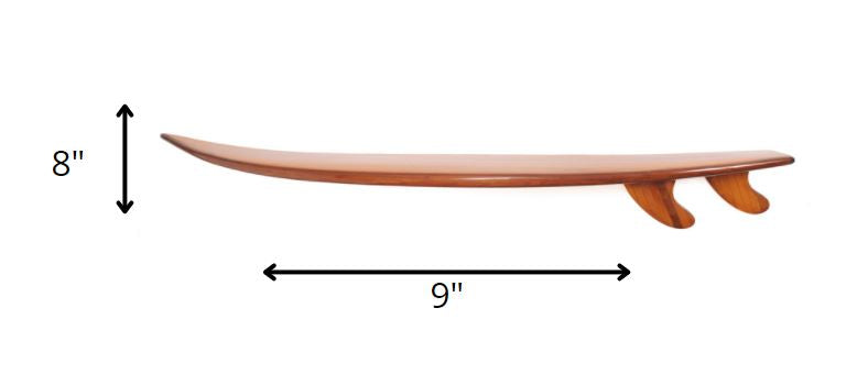 Take your love for surfing to a new plateau! This surf board shelf is amazing to look at, durable in purpose and smooth to the touch. Using the same techniques as on our water bound boards, this shelf is the epitome of handcrafted workmanship. Coated with epoxy, its glossy surface and rich wood tones make the perfect accompaniment to any room in your home. We guarantee you will love this product and whats more, visitors will surely be struck by the quality and stylishness. The thickness of the board is about 2" and it has 3 fins. Each fin is about 8" in length.