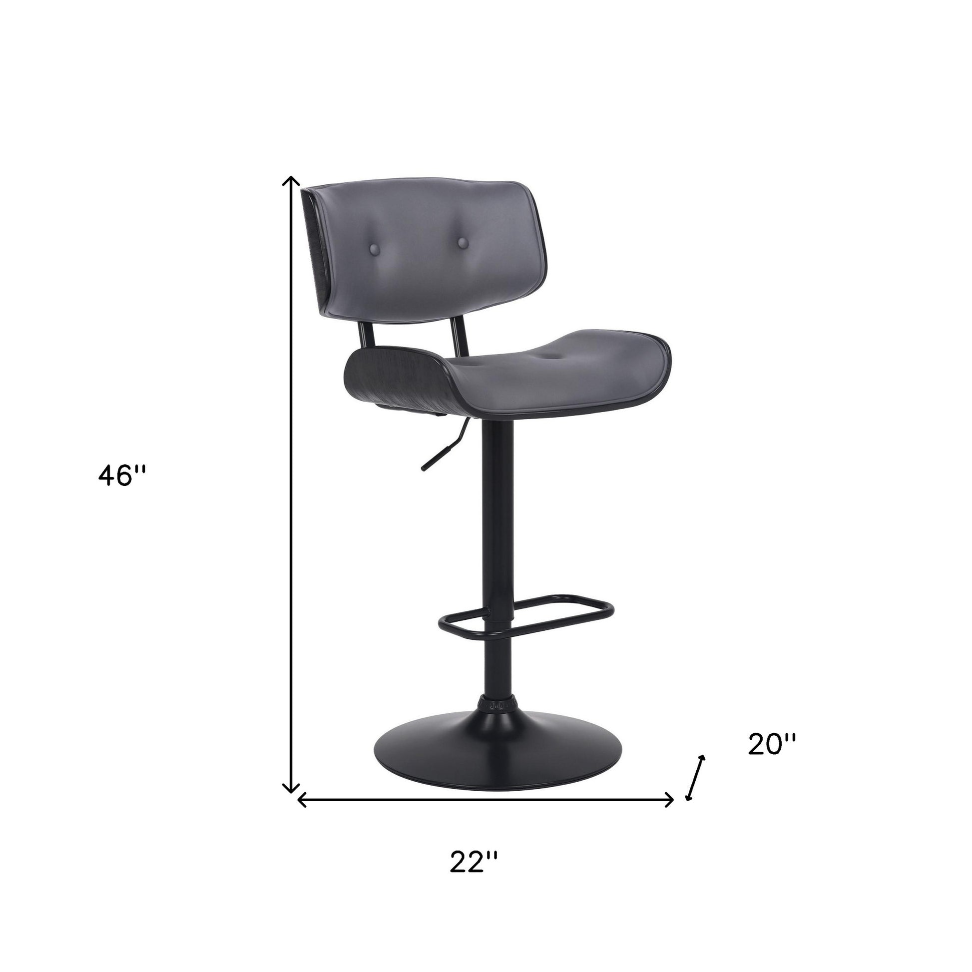 Adjustable Gray Tufted Faux Leather and Black Wood Swivel Barstool.