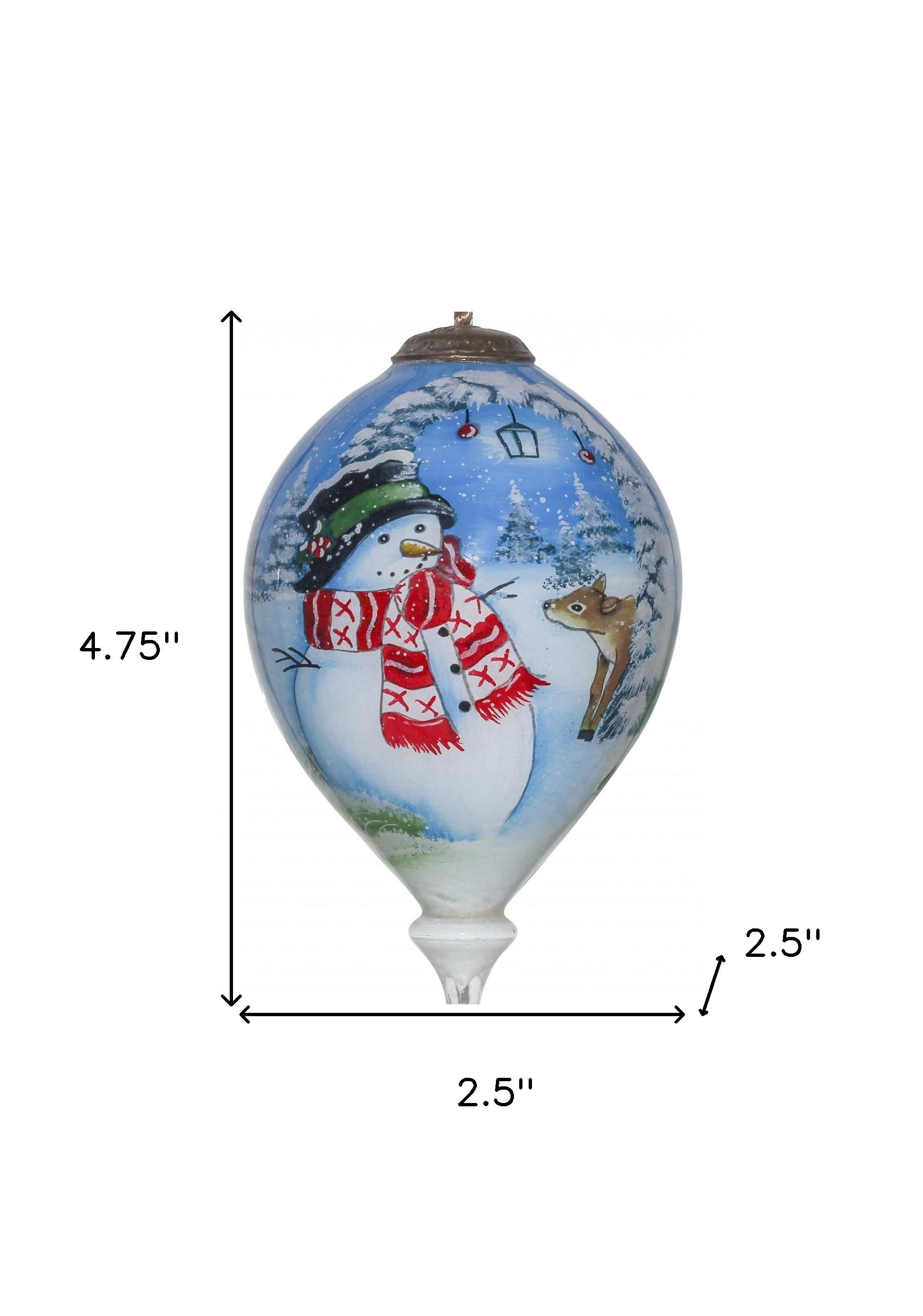 Bring out the inner beauty of Christmas with the Adorable Snowman and Deer Hand Painted Mouth Blown Glass Ornament. Using old world intricate techniques, the glass is hand-painted on the inside by skilled artisans. This gorgeous oval teardrop shaped ornament will be a treasured keepsake for your tree but can also be hung easily on an ornament stand. 4.75" x 2.5" x 2.5"