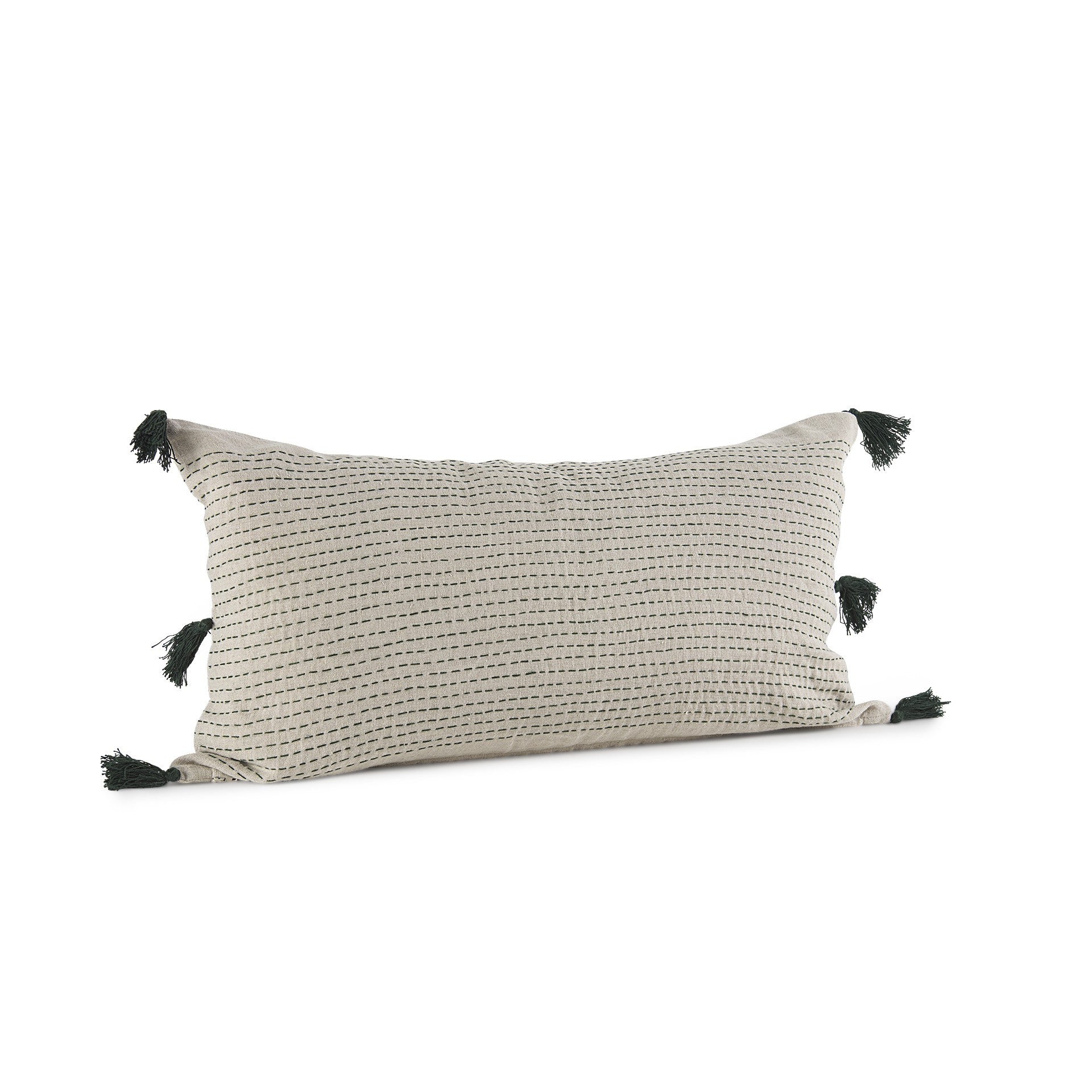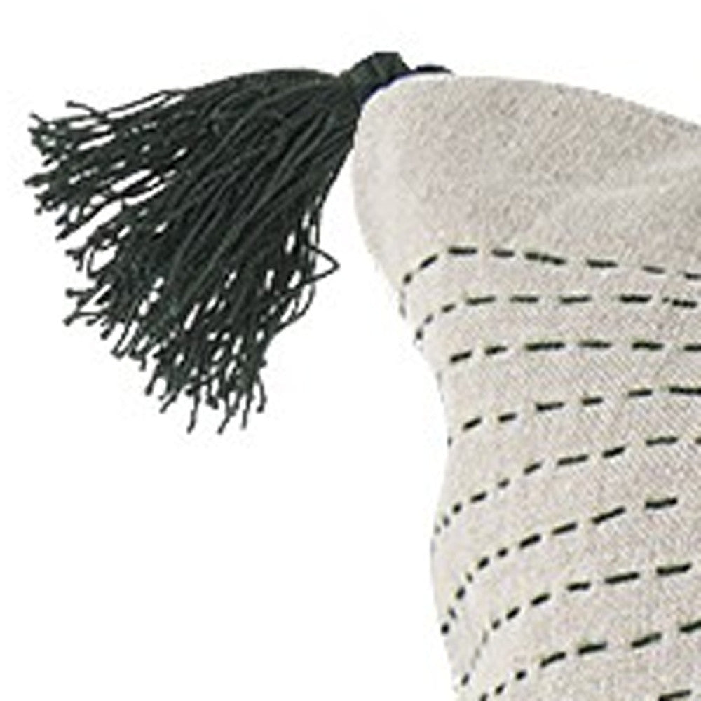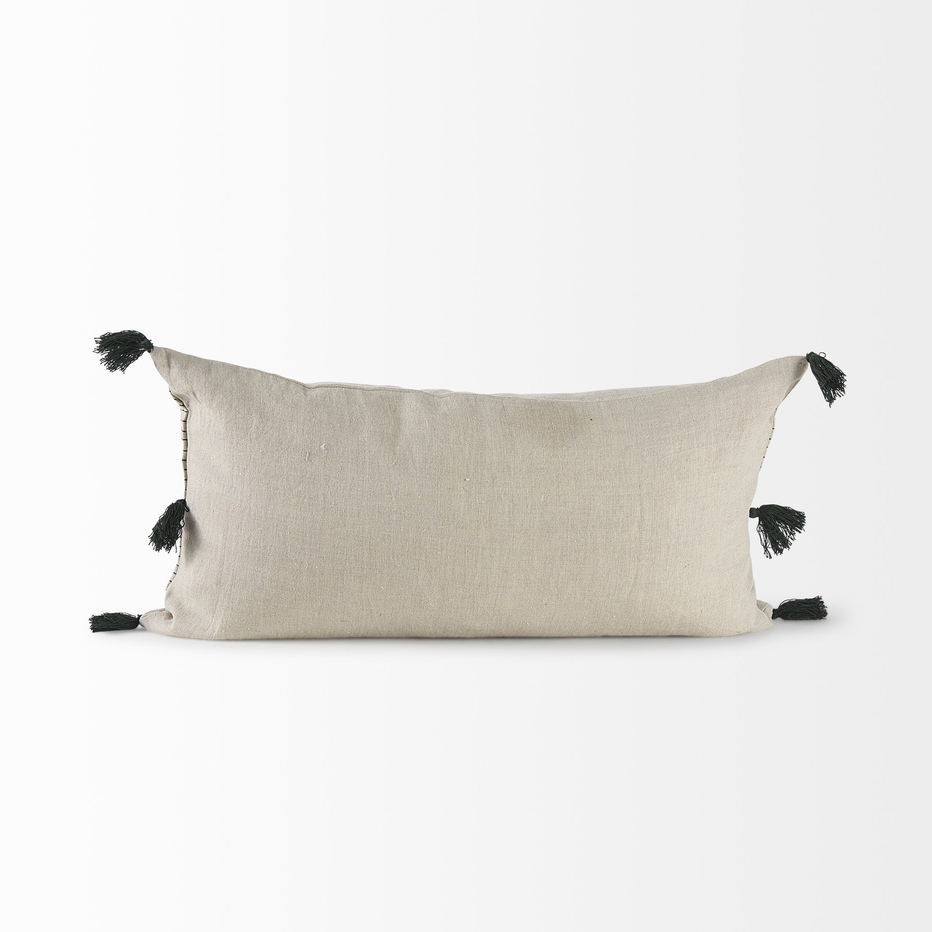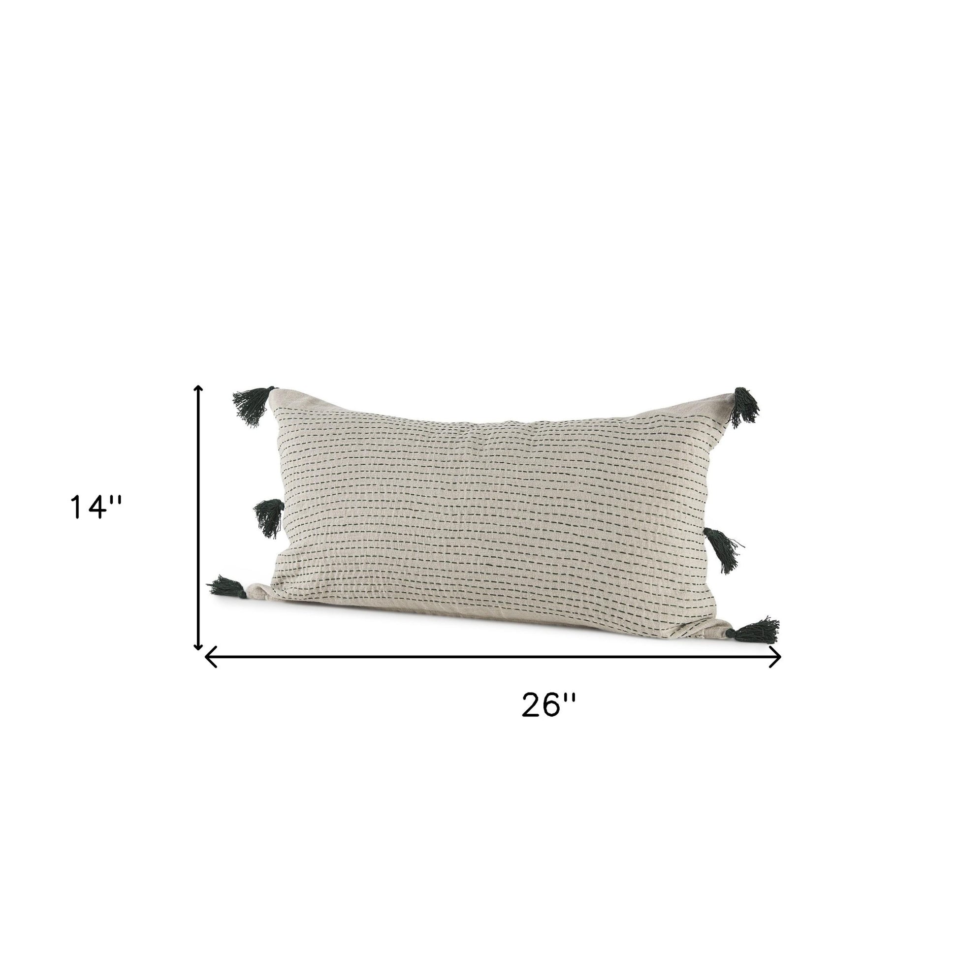 With this Beige and Dark Green Dotted Lumbar Pillow Cover you can add the perfect finishing touch to your couch. This pillow cover is made highly durable and soft linen material that provides comfort beyond measure and has a beige background with dotted details running in horizontal lines all over. There are three tassels on either side of the cushion cover. The back has a zip closure that ensures your cushion stays in there securely. The neutral color palette will look great on top of any couch, bed or chair you have and go with any interior style you have in your home. This cushion cover shape is also great for extra back support. 14" H x 26" W x 1" D