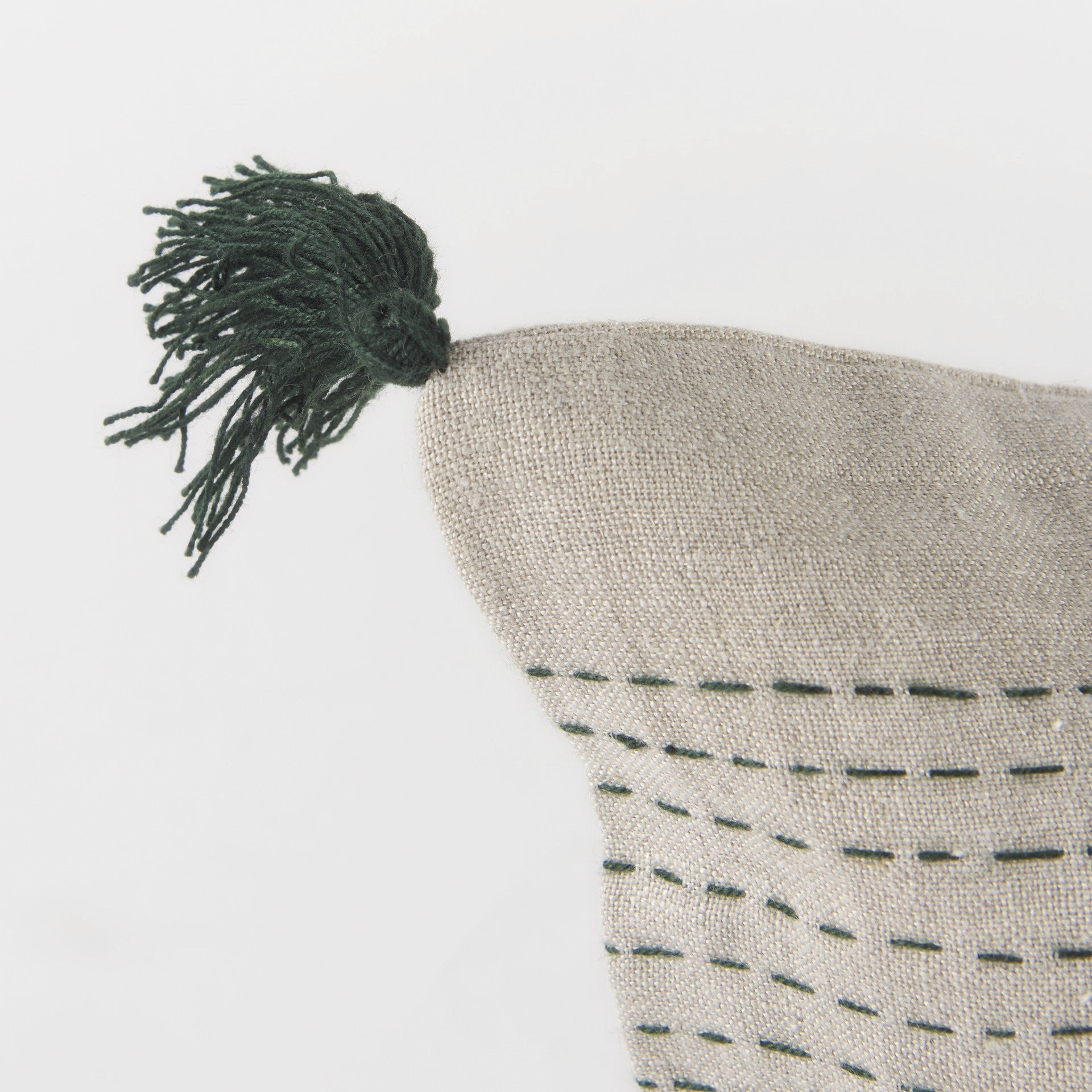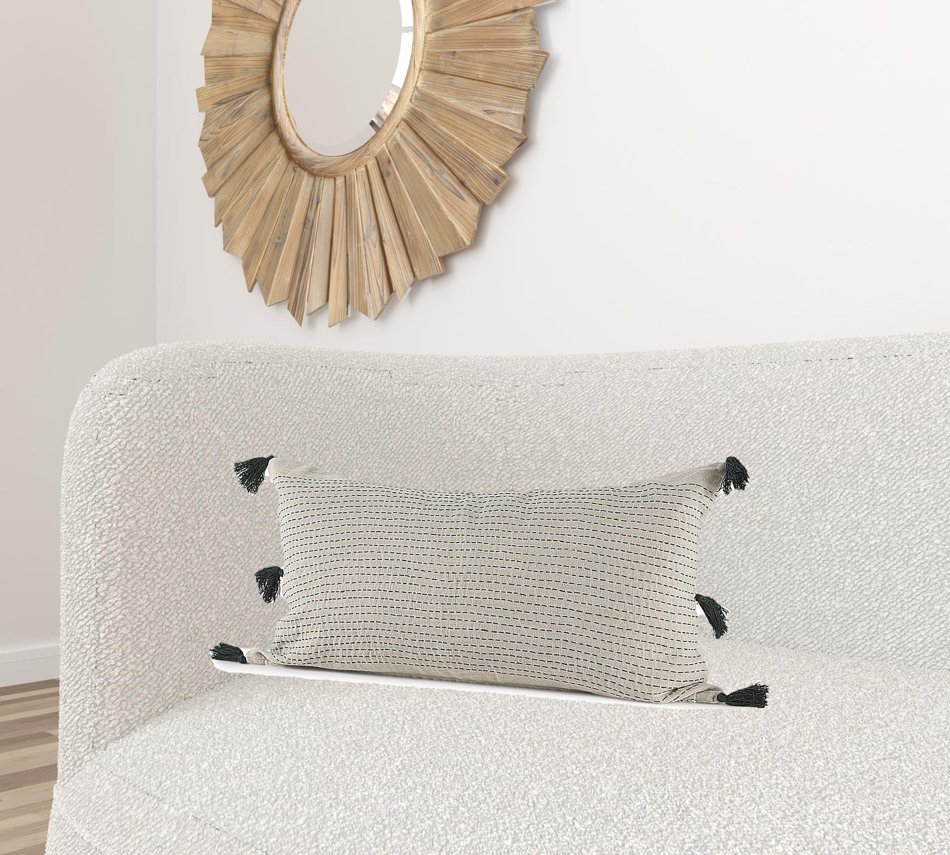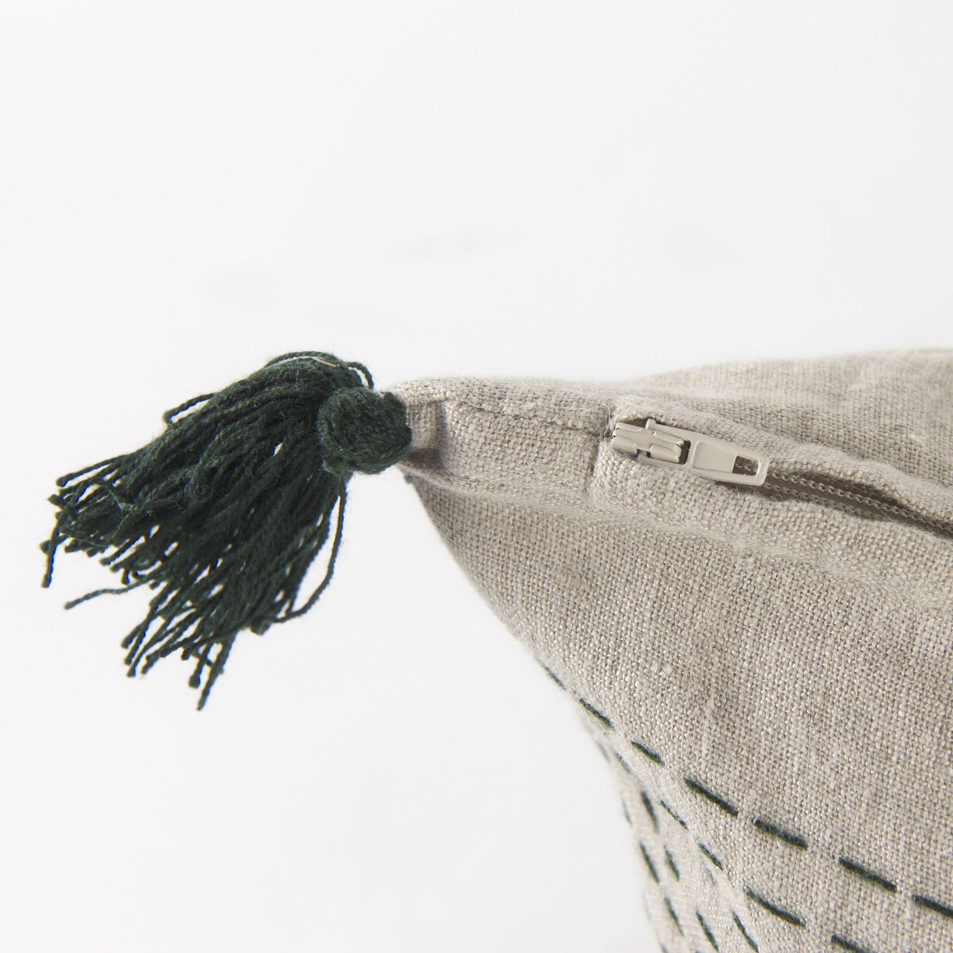 With this Beige and Dark Green Dotted Lumbar Pillow Cover you can add the perfect finishing touch to your couch. This pillow cover is made highly durable and soft linen material that provides comfort beyond measure and has a beige background with dotted details running in horizontal lines all over. There are three tassels on either side of the cushion cover. The back has a zip closure that ensures your cushion stays in there securely. The neutral color palette will look great on top of any couch, bed or chair you have and go with any interior style you have in your home. This cushion cover shape is also great for extra back support. 14" H x 26" W x 1" D