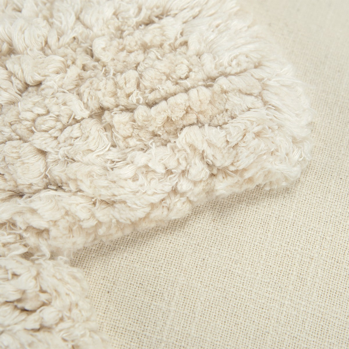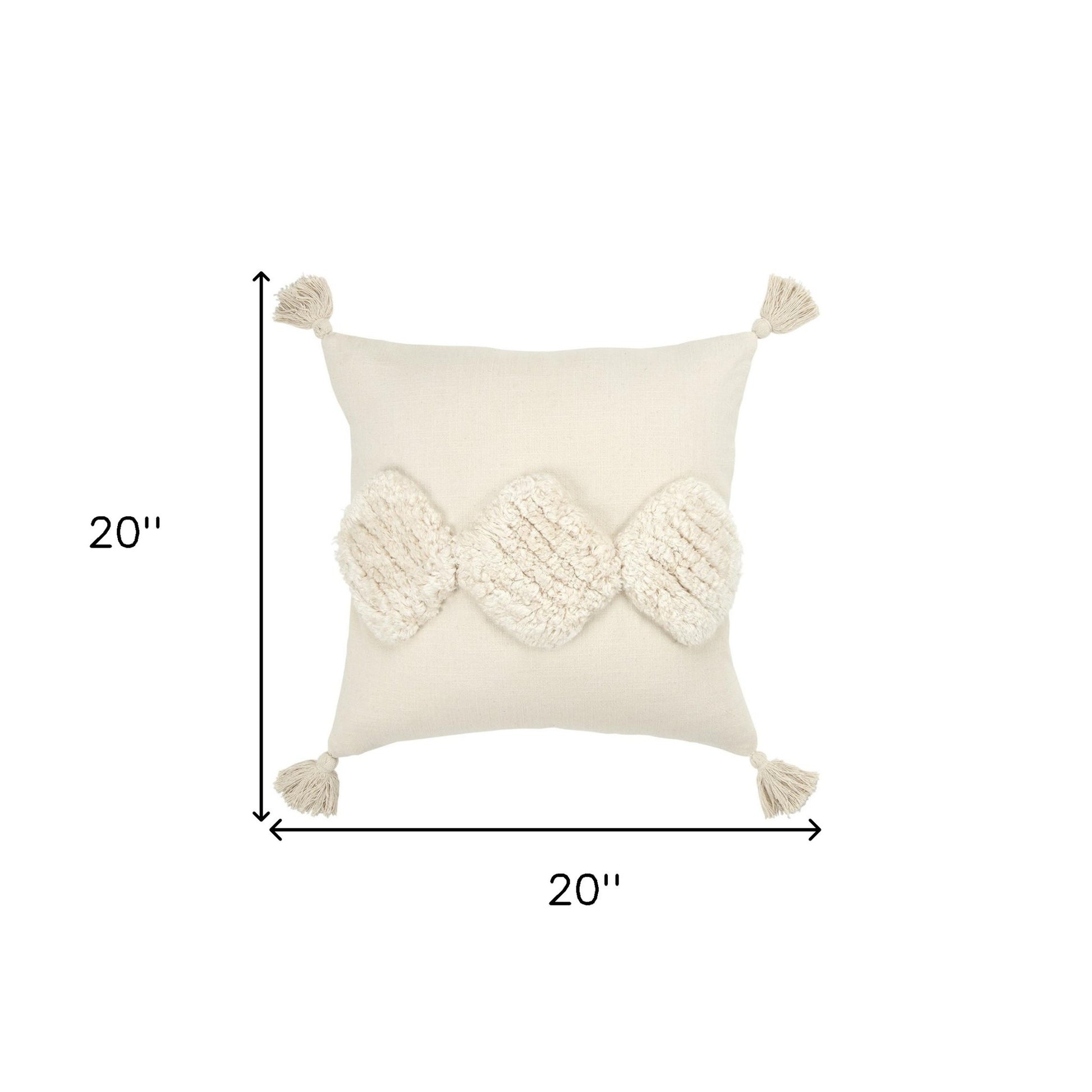Embrace the artisanal textures of this Beige Textured Diamond Trio Throw Pillow that brings the splendor of modern minimalism into your home. Embellished with heavily textured diamond patterns in beige, the pillow sports a monochromatic palette with tassels on each corner for a bohemian flair. Crafted with a top-notch cotton material, the pillow is soft and luxurious on the touch which guarantees long-lasting durability. The back of the pillow features the same cotton fabric and comes with a hidden zipper closure for ease of cleaning. The pillow includes a plush polyfill insert that gives it a soft and comfy texture to be an ideal accent of class and comfort in your living room. Envision laying in your urban farmhouse surrounded by minimalist décor built around the visual of this breathtaking throw pillow. 20" x 20" x 6.25”