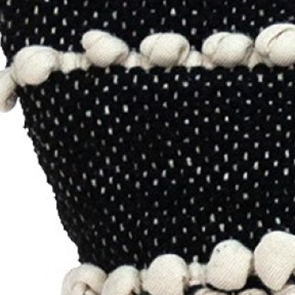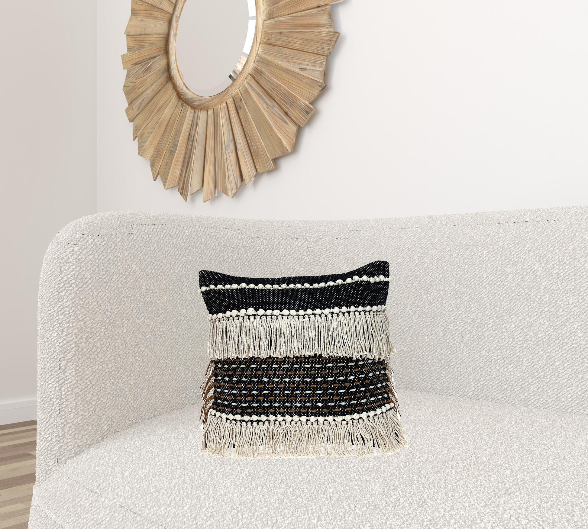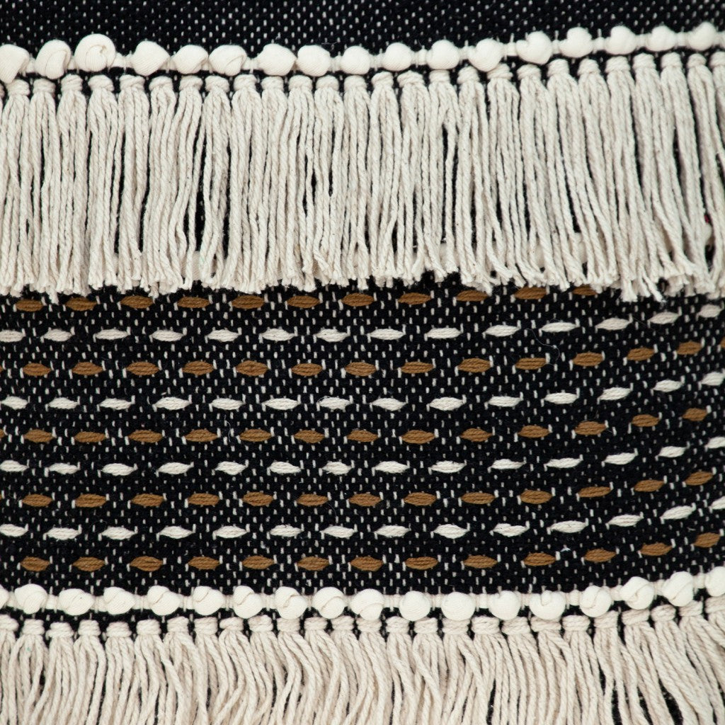 Make your favorite armchair warm and cozy for this fall and winter with this Black and Ivory Textured Throw Pillow. This pillow has a dark background in black, filled with different textures in ivory and brown colors, which include lines, knots, and fringes. Its hand woven pattern makes it blend well anywhere, and there is a zipper closure on the back. 17.72” x 17.72” x 4”