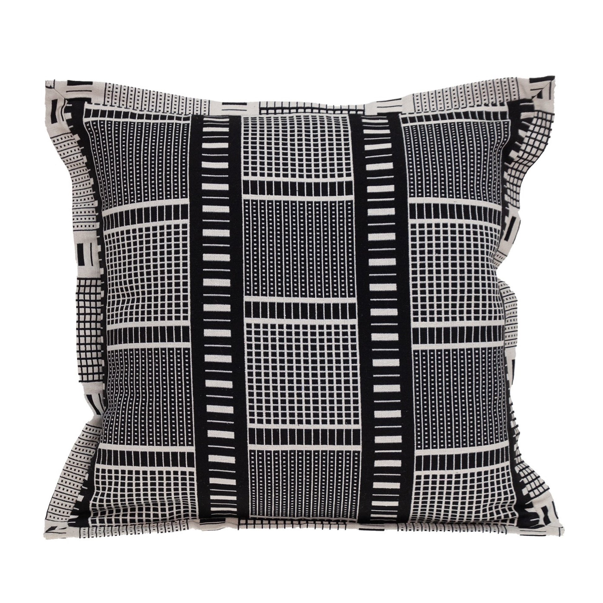 Add a cheerful element to your furniture with the Black and White Abstract Stripes Throw Pillow. The pillow is beautifully designed with white graphic abstract stripes against a solid black backdrop, suitable for any type or style of furniture. This is a 100% cotton pillow with a zipper closure on the back, and requires dry cleaning or spot cleaning. 20” x 20” x 5”