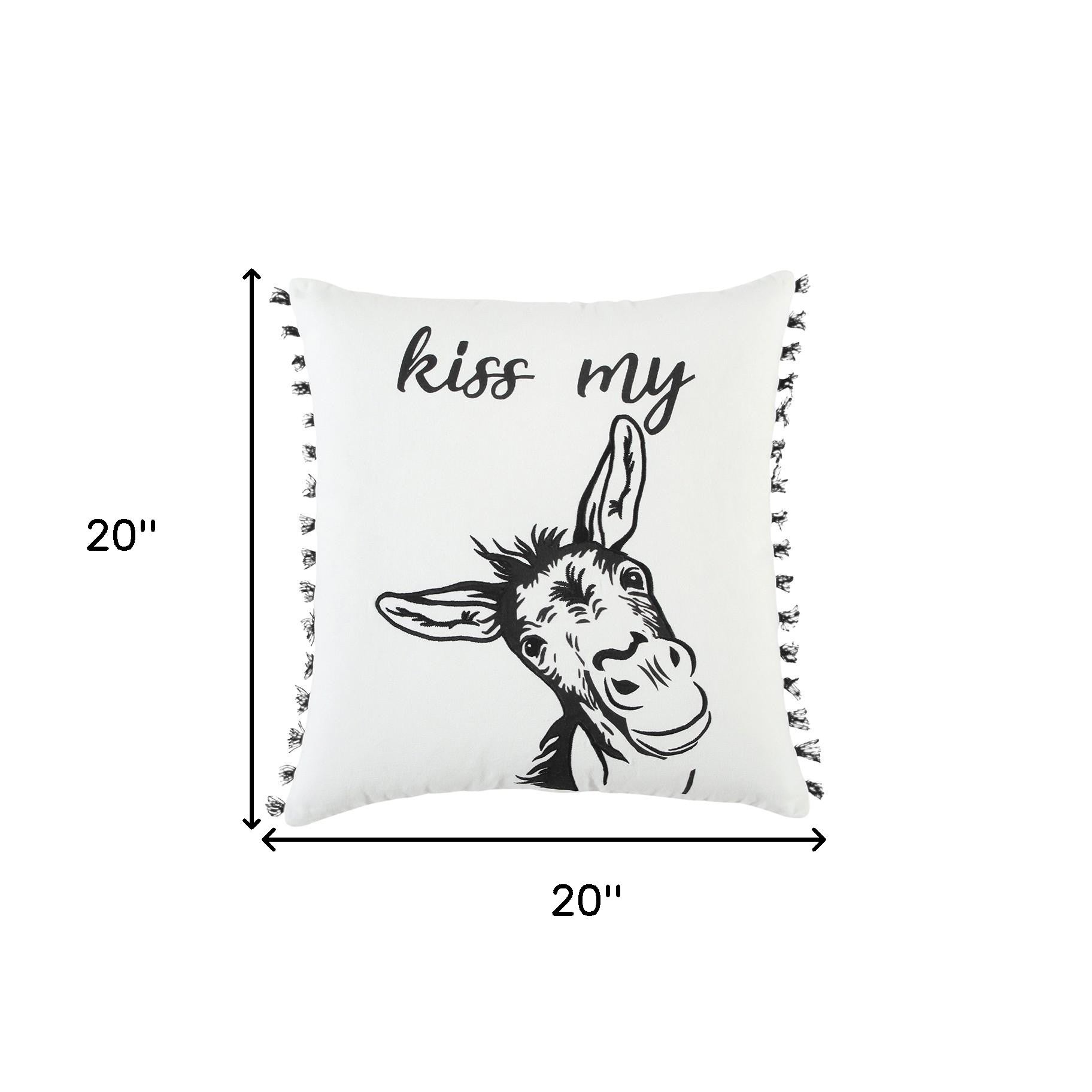 Let this Black and White Humorous Donkey Throw Pillow be the conversation piece of décor in your living room. The quirky donkey face is printed on the surface to symbolize fortitude, while the message can be relatable in both humorous and serious notes. The classic color palette with black on white makes the pillow a classic piece of décor with the embroidered accents and hand-tied accents for texture and dimension. The white cotton duck fabric is featured on the pillow for ultimate softness and durability. The back features a hidden zipper closure for ease of fill and cleaning. Evoke a cheerful atmosphere into your contemporary home with this decorative throw pillow in the room. 20” x 20” x 6.25”
