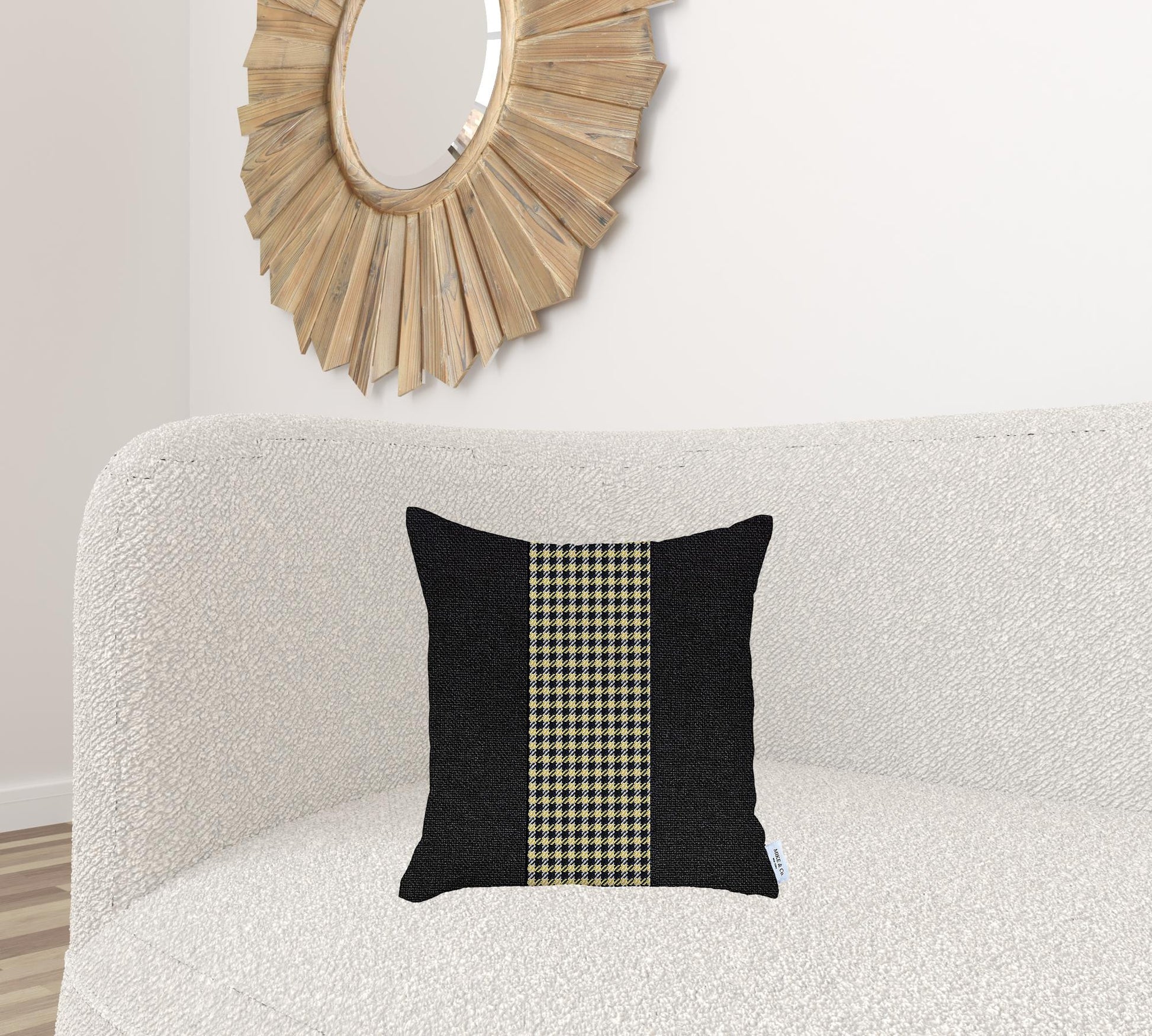 Emphasizing the elegance of modern artistry, this Black and Yellow Houndstooth Throw Pillow will induce a rich and luxurious appeal to your contemporary living space. The matte black surface flanking a midsection with black and yellow jacquard weaved houndstooth pattern to elevate the entire look for visual contrast. Skilfully crafted in Turkey with OEKO-TEX Standard 100 certified polyester fabric to ensure high product safety and durability. This pillow should only be spot cleaned to keep its shine for years to come. For a seamless unified finish on the touch, the pillow sport an all-around hidden zipper closure while the soft poly filling inside provides maximum comfort. This classic decorative pillow will effortlessly blend in your modern household and align with your sense of interior styling. 18” x 18” x 1”