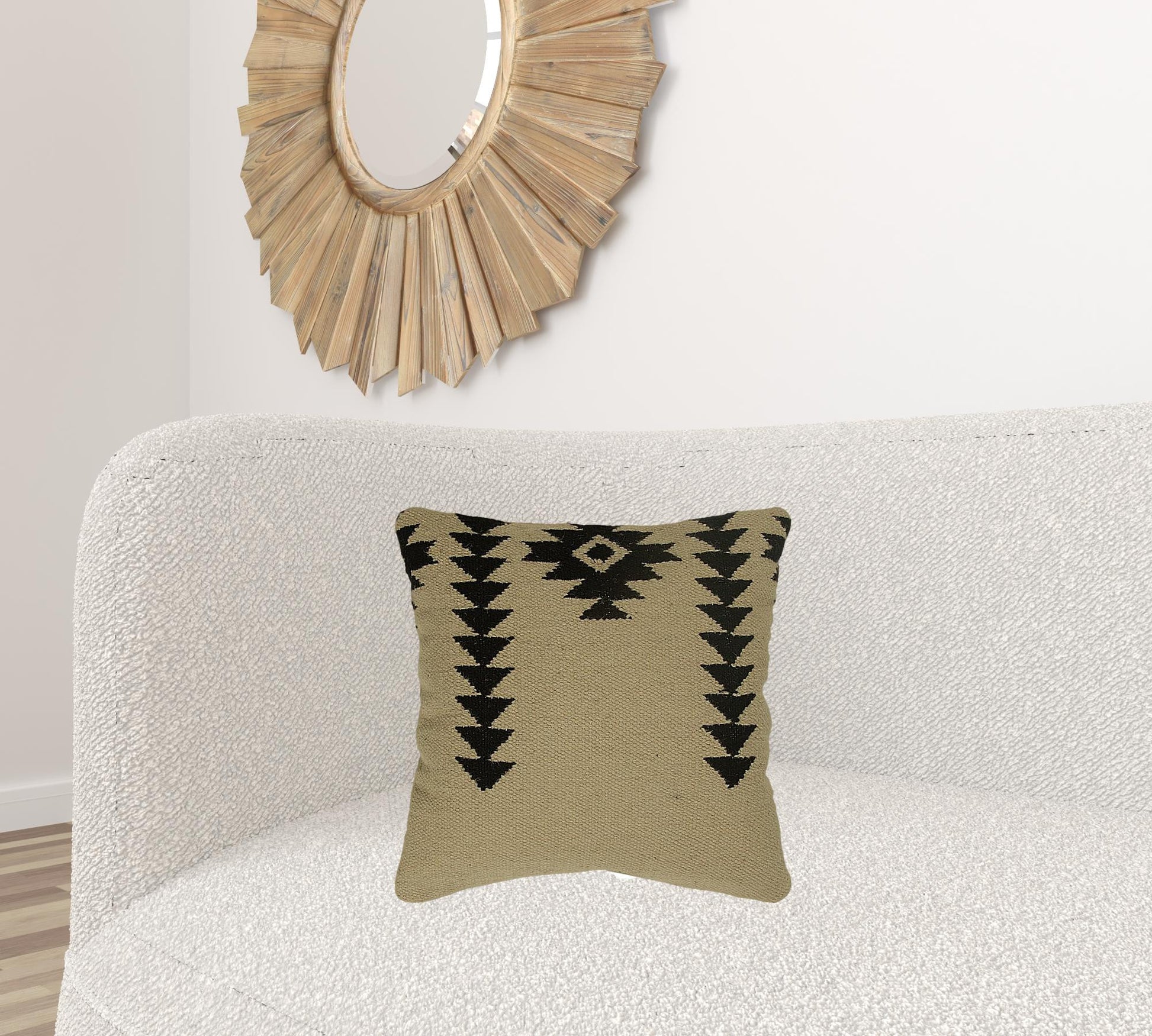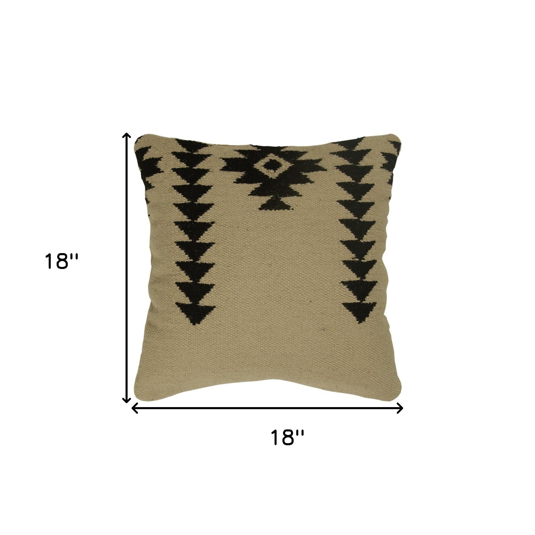 Showcasing tribal prints in a trendy fashion, this Black Beige Minimal Mod tribal Pattern Throw Pillow exudes an aura of cultural diversity with modern minimalism. The artistic impression of tribal patterns in black is flaunted over a beige-toned base for a classic contrast which is sure to complement the aesthetics of any modern, traditional, or bohemian home. Handcrafted in wool yarns using the rug flat weaving technique for a luxurious surface texture that adds dimension to the pillow, ensuring enhanced durability for years to come. To work well amidst modern settings, this down-filled pillow guarantess a soft and airy feel with knife edging for a polished look. The back side of the pillow has a solid cotton fabric and features a zipper closure concealed for a seamless finish and ease of cleaning. Reconnect with the beauty of global aesthetics with the distinctive tribal patterns of this stunning throw pillow in your living room. 18” x 18” x 6.25”