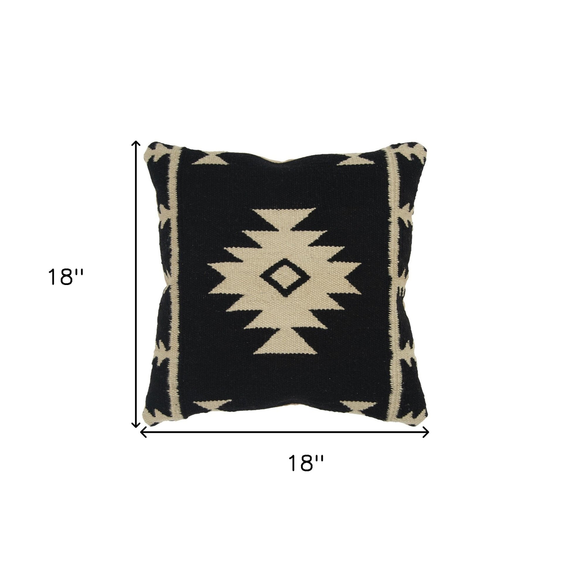 Representing global cultures with modern artistry, this Black Beige Tribal Woven Pattern Throw Pillow stands out in its tones and textures to be an ideal fit in any modern or traditional home. The tribal motif in beige creates a stunning contrast over the charcoal black base, emphasizing an authentic tribal essence with a modern flair. Skilfully handcrafted with wool yarns in a classic flat weaving technique to ensure a sturdy construction with a plush surface texture. This two-colored pillow is down-filled for an airy-soft feel and fluffy appearance which is meant to offer maximum comfort every time you sit or lie on it. With a solid coordinating back and hidden zipper closure, the pillow has a unified look while the crisp and clean aesthetics of the corners can be attributed to the knife edges all around. If you want a traditional accent without giving up on modern aesthetics, go for this exquisite throw pillow to accentuate a sense of cultural presence in the room. 18” x 18” x 6.25”
