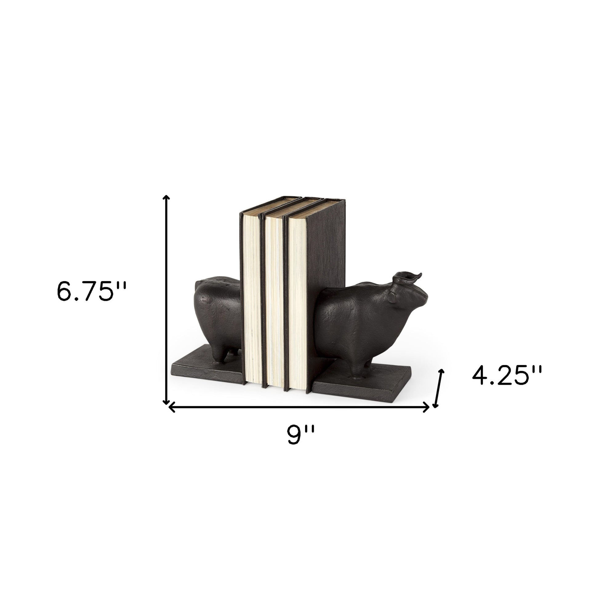 Add a whimsical and elegant touch to your bookshelf with these Black Cast Aluminum Bull Bookends. These bookends are made from cast aluminum which makes them sturdy and durable enough to hold as many books as you want without slipping or moving around. The bookends are shaped like a rounded bull with curved horns split into two which gives the illusion of being whole when you stack them together. The finish of the bookends is in matte black which gives them a rustic look. The unique yet understated look of these bookends will work with any interior style you have in your home. You can use these bookends to display your books or you can use them as stand-alone decor pieces as well. 6.75" H x 4.25" W x 9" D