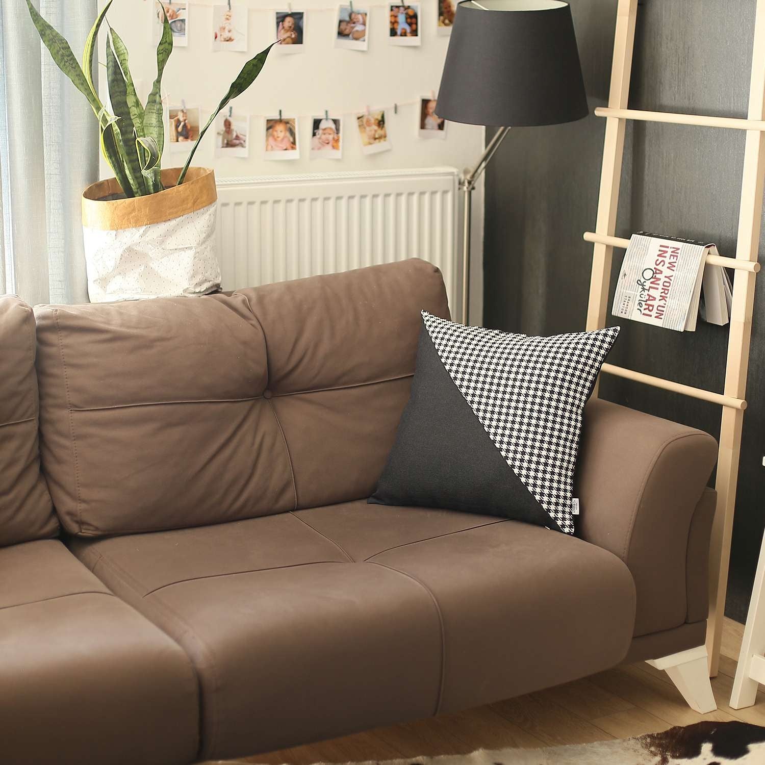 Embracing the sophistication of modern styling, this Black Houndstooth Modern Decorative Throw Pillow will tie together the aesthetics of your living space with a stylish impression. Made in Turkey with durable polyester fabric which is OEKO-TEX Standard 100 certified to ensure product safety and optimum quality. The fabric should only be spot cleaned to keep its pristine look for years to come. Featuring the houndstooth checkered pattern in black and white diagonally separated from the solid charcoal black end to create visual intrigue. Made to feel soft and seamless on the touch, the hidden zipper closure all around does the trick while the soft poly insert contributes to the fluffy look and cozy feel. Place this stylish throw pillow on the sofa, couch, or sitting area and it will add a modern-classic vibe to the room. 18” x 18” x 1”