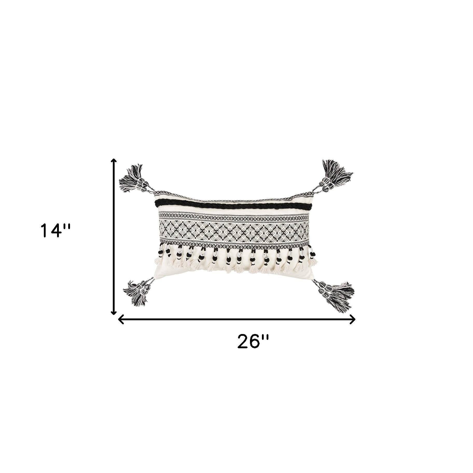 The classic beauty of this Black White Ornate Panel and Tassel Lumbar Pillow is the perfect fit to add a tribal essence to your living space with a modern poise. Superbly detailed with black hoops over an ivory overlay and suspended double swing tassels braided onto the center panel for texture and dimension. The corner tassels add a bohemian flair to the pillow and make it a stunning decorative accent to pair with your interior décor. Constructed with the softest cotton material, the pillow is cozy and sturdy at the same time to maximize comfort without compromising durability. The pillow features a solid cotton back with a hidden zipper closure for easy cleaning. The soft polyfill insert gives it a cuddly feel with a fluffy look. The monochromatic charm of this pillow evokes a modern edge with a tribal quality that will captivate your guests and set an inviting tone in your living room. 26” x 14” x 6.25”