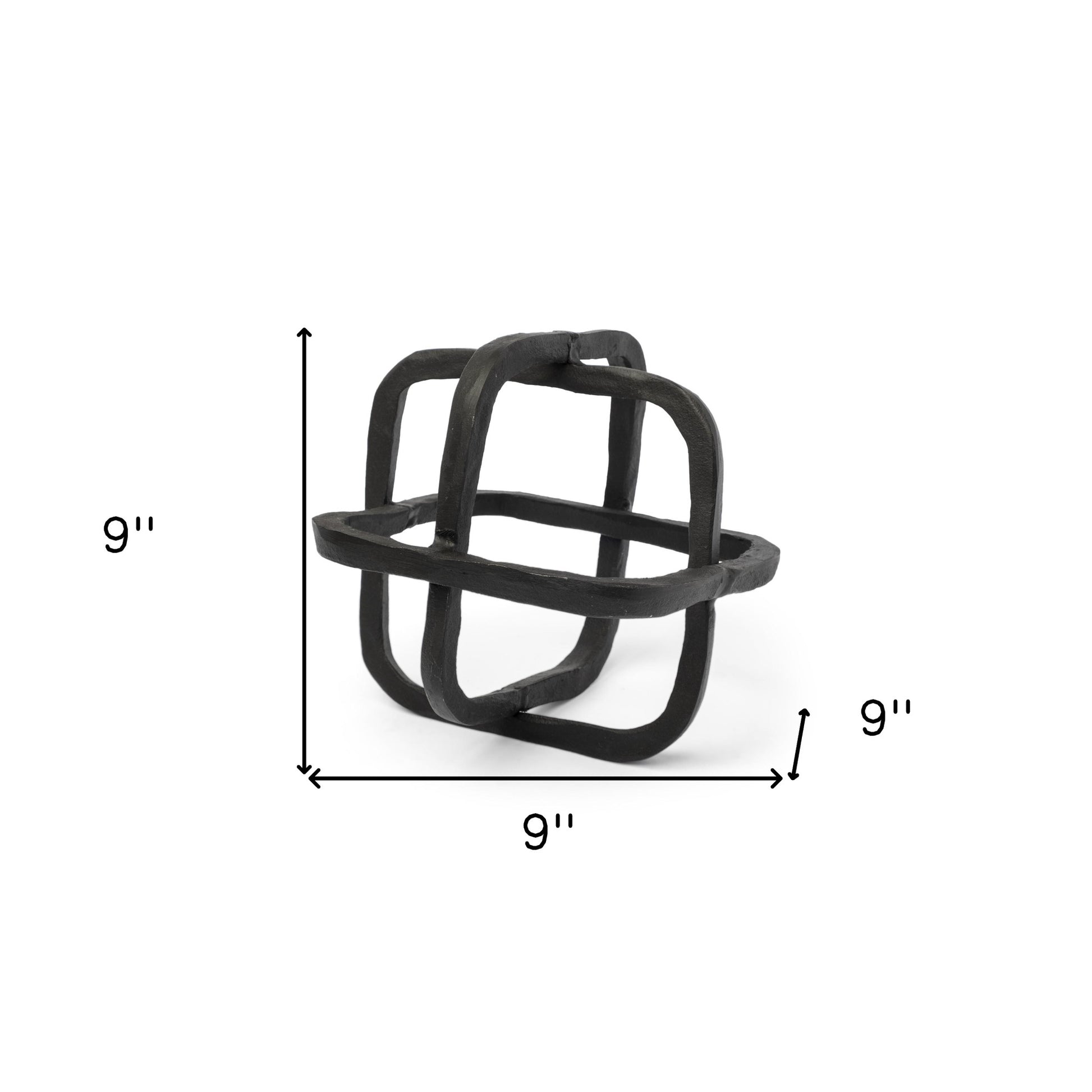 With this Black Metal Cube Shaped Link Sculptureyou can add the perfect touch of industrial design to your home. This piece is made from solid metal and has a vintage inspired black finish on top. There are three separate rounded square metal shapes that intersect to create this 3D cubed link shape. These shapes have rough edges that give it handmade look and adds texture to this piece. This decor piece will look great in any room in your home owing to its neutral colorway. Display it on your bookshelf, or use it as coffee table decor. 9" H x 9" W x 9" D