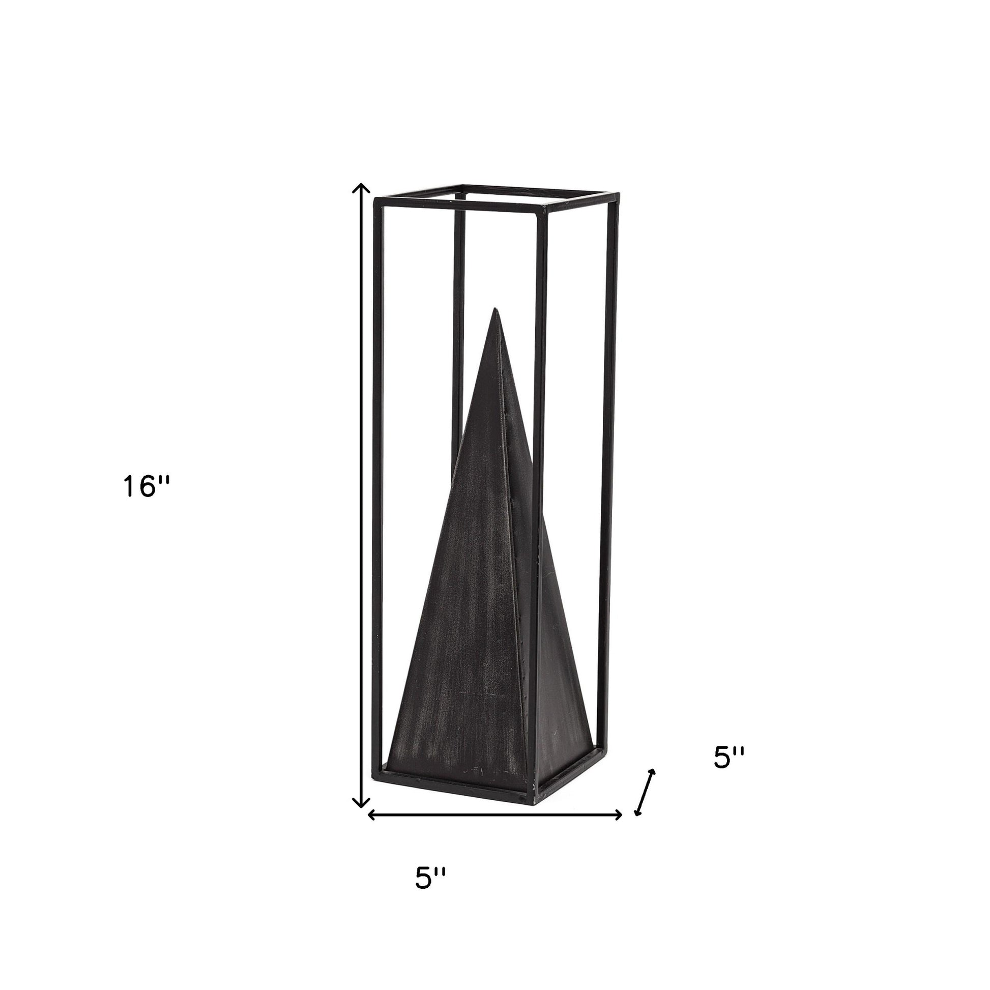 With this Black Metal Framed Pyramid Sculptureyou can add the perfect touch of contemporary design to your home. This sculpture is made from solid metal and has a distressed black finish on top of it. There is a thin hollow frame with a solid base inside of which there is a solid metal pyramid. This decor piece has a very minimal and sleek design which means it will look great with any existing decor or colors you already have in your home. You can use this decor piece in your living room, in your library on the shelves, or even in your kitchen as open shelf decor. 16" H x 5" W x 5" D