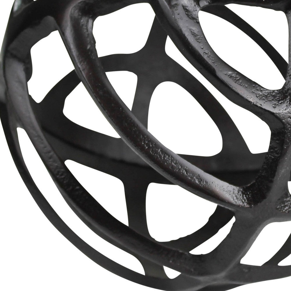 Add a touch of contemporary design to your home with this Black Metal Geometric Sphere. This piece is made from metal and has a circular orb shape to it. The general circular shape is made up of different metal rods are that intersecting at different points. The open nature of this piece gives it a very airy feel while the black finish on top makes it look more formal. You can use this unique decor piece anywhere in your home and it will look great owing to its neutral colorway and minimal design. You can group it up with other decor pieces or use it as a stand-alone piece. 7" H x 7" W x 7" D