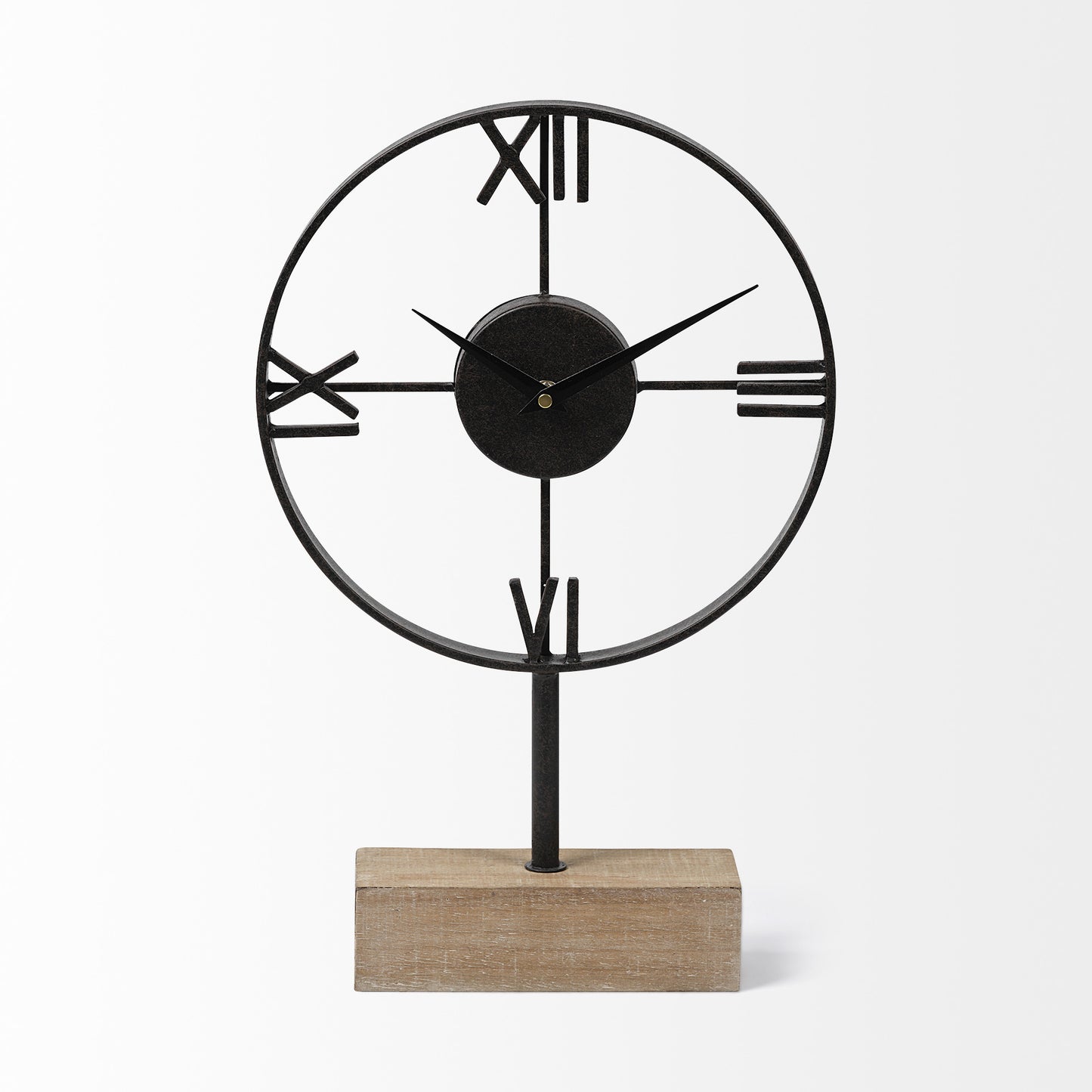A Classy, Open Frame Table Clock Crafted From Metal And Braced By A Whitewashed, Wooden Base. It Flaunts Metal Hands And Clean Roman Numeral Markings At Right Angles That Make Reading Time From A Distance Easy.