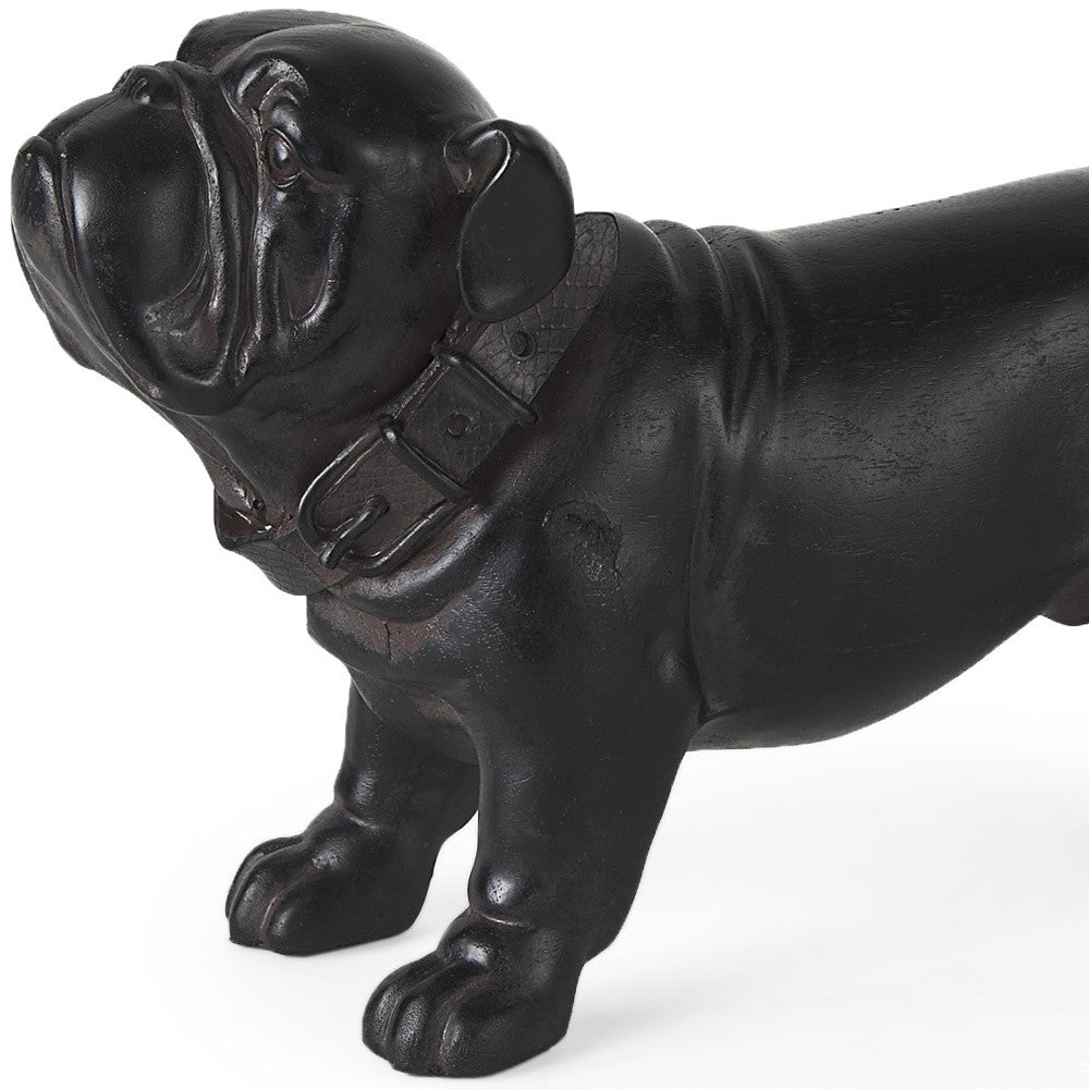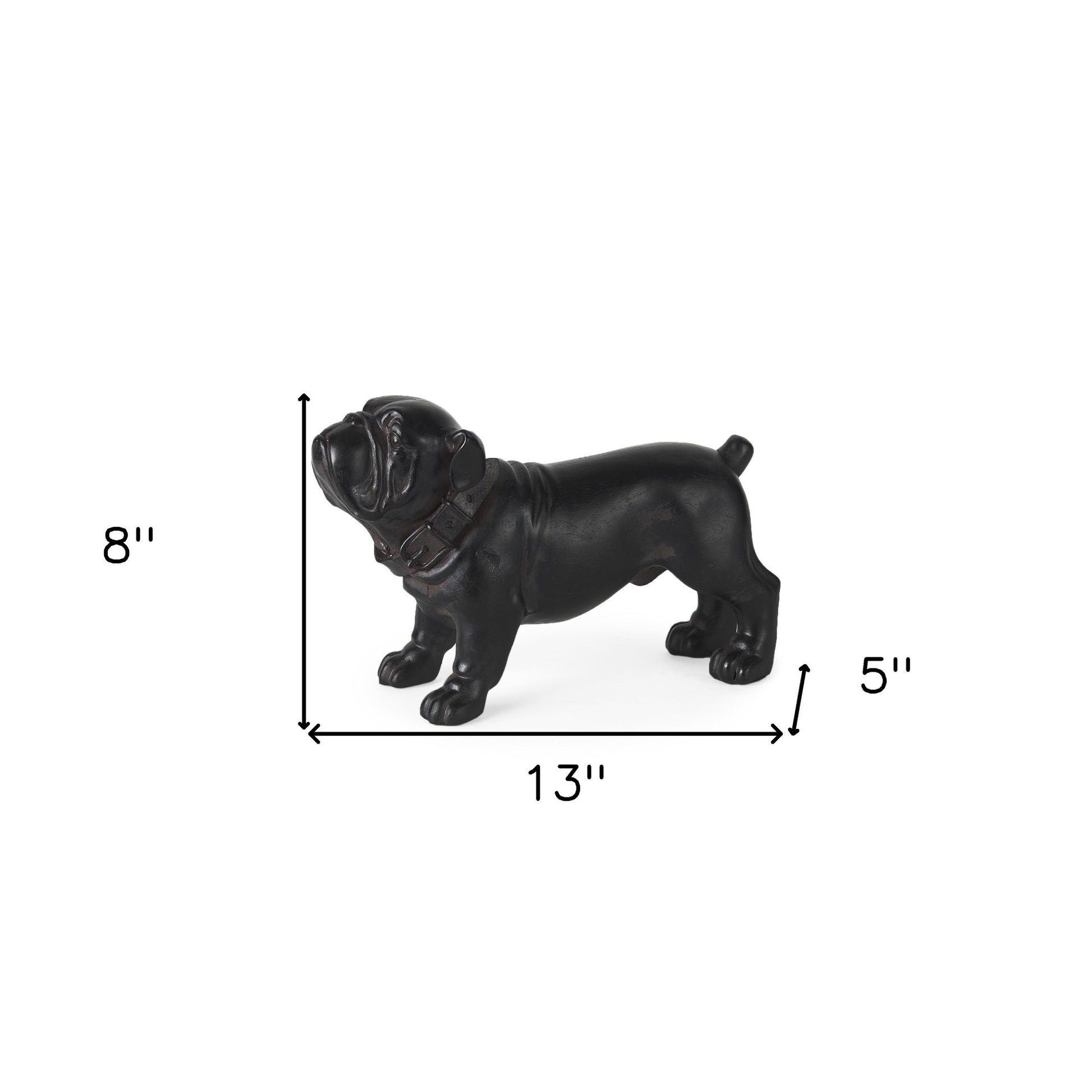 With this Black Resin Bulldog Sculpture you can add the perfect touch of whimsical design to your home. This decor piece is made from resin which makes it durable and has been colored to a matte black finish. The bulldog shape is very unique and has detailing in it that adds depth and dimension to the whole piece. While the nature of this piece is whimsical, the matte black finish makes it great for formal decor as well. You can use in your kitchen, in your living room, on your bookshelf, or in a children's play room. 8" H x 13" W x 5" D