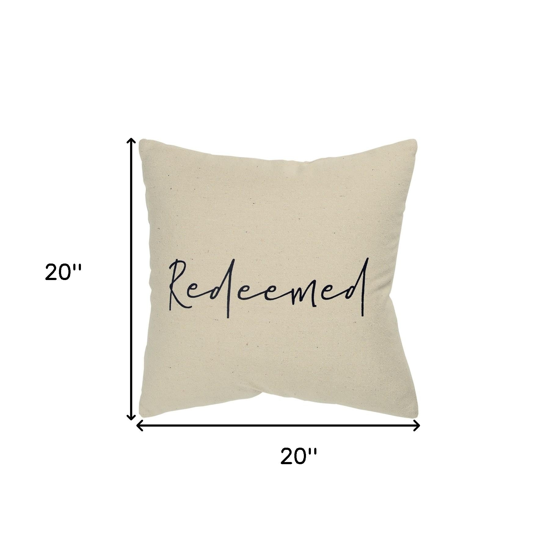 Flaunting a spiritual sentiment in a modern font, this Black Taupe Canvas Redeemed Throw Pillow features a simple yet stylish look to spruce up your living space. The word ‘Redeemed’ is written in black over a taupe base which gives the pillow a modern edge while accentuating a sense of achieving salvation in its sentimental text. Made from recycled cotton canvas with a lightly textured surface for a luxurious feel on the touch, while the knife edging gives a modern appeal to the pillow. The pillow features a solid matching back with a hidden zipper closure for convenience. The classic color palette and simple design of this decorative pillow make it an ideal fit for modern or contemporary homes. 20” x 20” x 6.25”