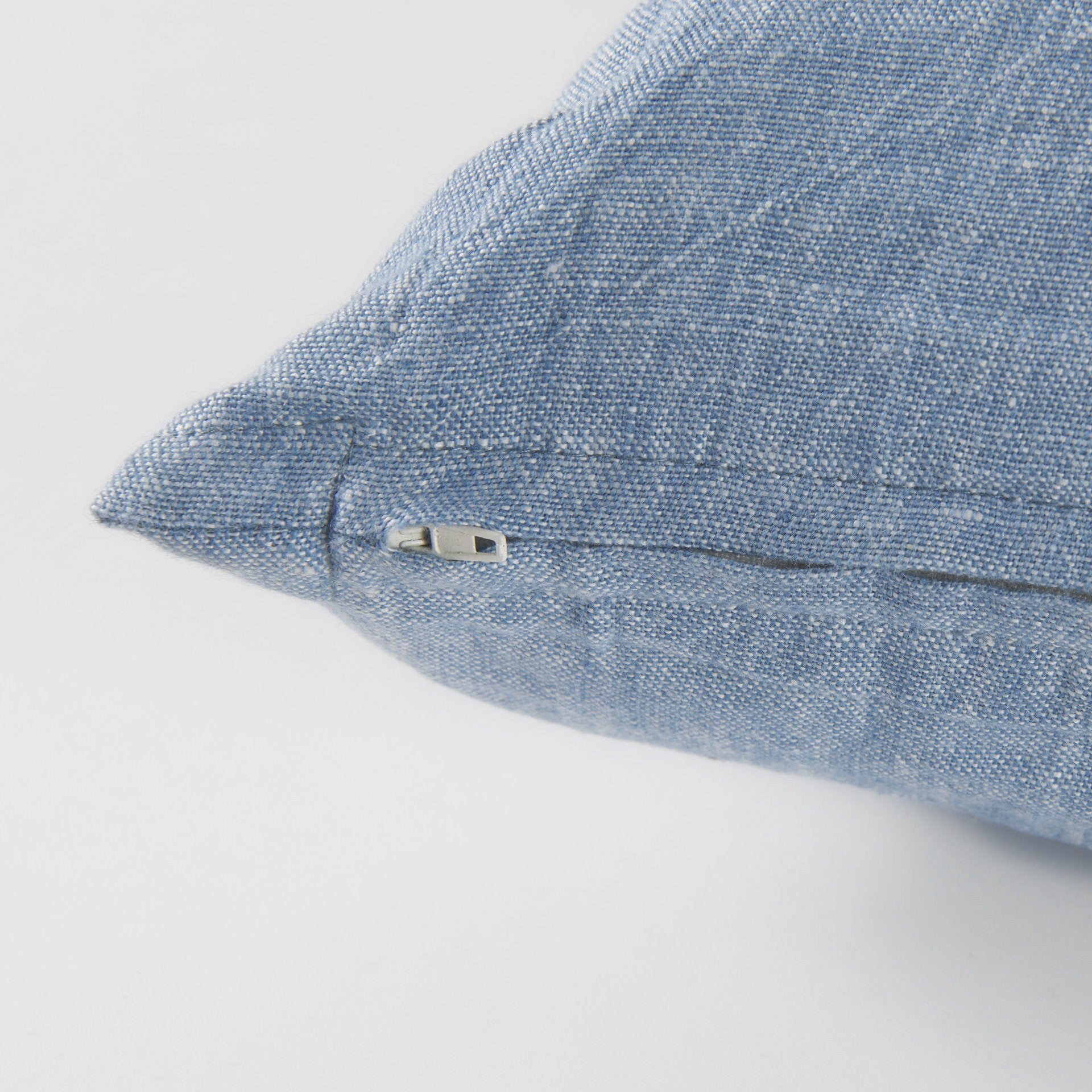 With this Blue and Light Gray Middle Striped Lumbar Pillow Cover you can add the perfect finishing touch to your couch. This cushion cover is made highly durable and soft linen material that provide comfort beyond measure and has a blue background with five different stripes in a cream color in the middle of the cushion cover. The back has a zip closure that ensures your cushion stays in there securely. The neutral color palette will look great on top of any couch, bed or chair you have and go with any interior style you have in your home. This pillow cover shape is also great for extra back support. 14" H x 26" W x 1" D