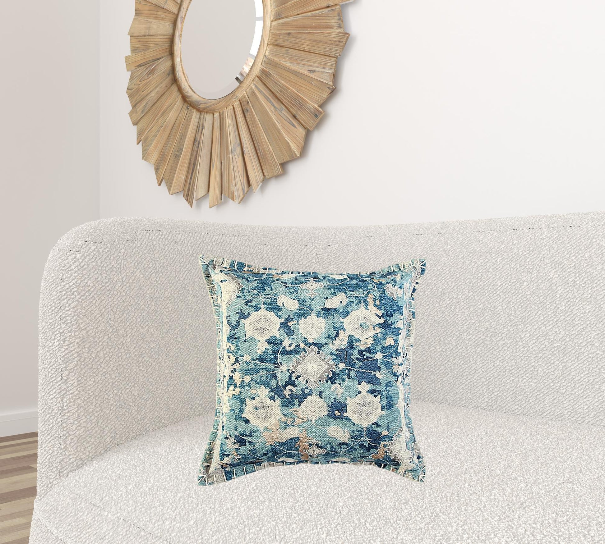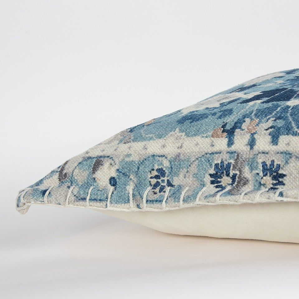 The soothing hues of this Blue White Abstract Artisanal Throw Pillow will evoke a sense of serenity into your home without compromising modern style. The abstract splashes of blue and white with hints of beige create an eye-catching pattern while the button-hole embroidered stitching on the flange gives the piece an artisanal appeal. The embroidered accents add visual detail and dimension to the pillow face. Crafted on a textured cotton canvas, this pillow is soft yet durable to serve you for years while the polyfill insert ensures a soft and cozy feel. The solid cotton back comes with a hidden zipper closure which makes filling and cleaning absolutely hassle-free. Abstract patterns and cool-toned colors make this decorative throw pillow an ideal piece for your contemporary home. 20” x 20” x 6.25”