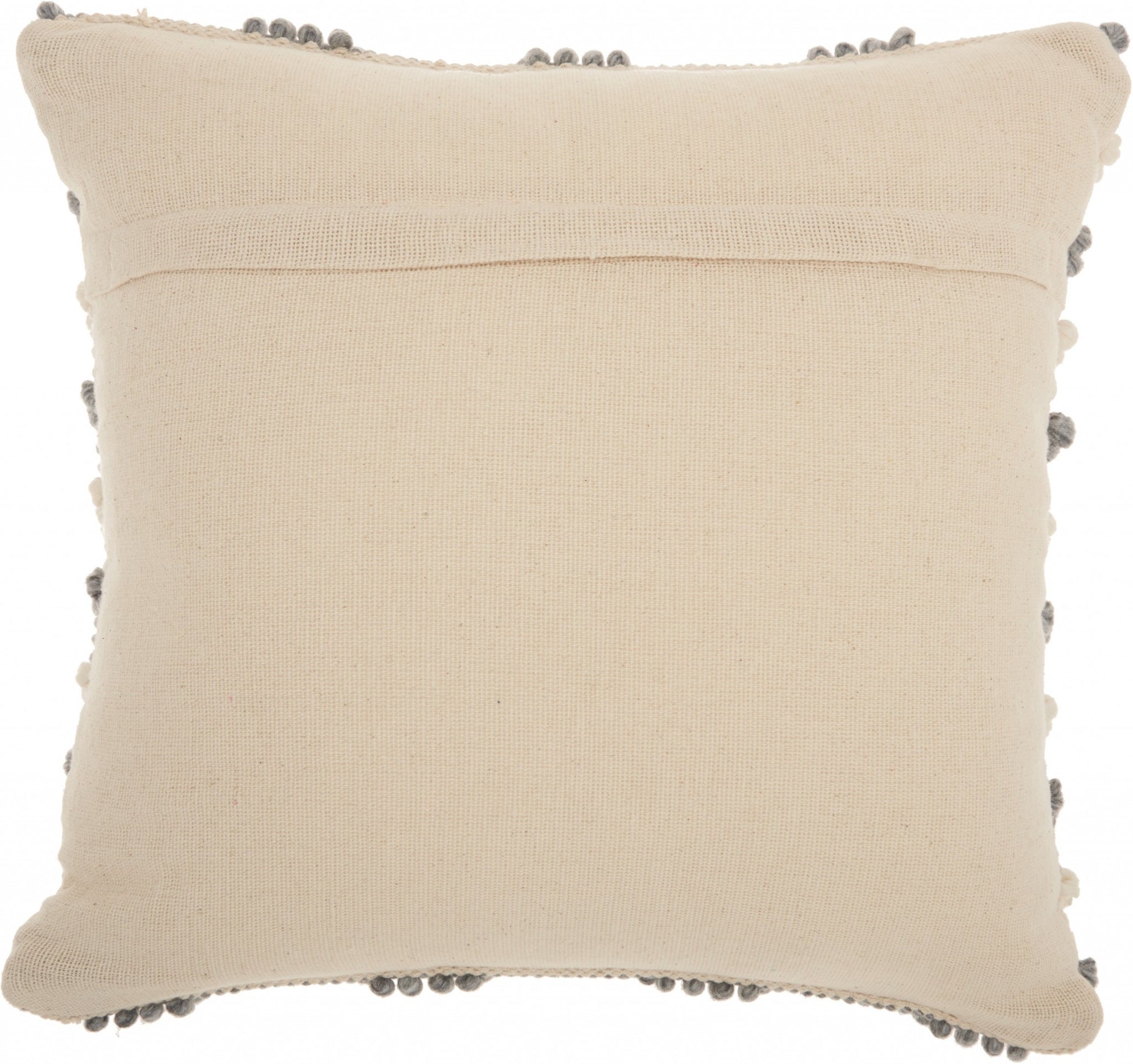 This Bohemian Cream Detail Throw Pillow will help you elevate the look of any seating space in your home with its unique design and neutral color palette. This square shaped pillow is covered in a textured cream colored fabric on top which there are two tone details made from macramé rope. The background features a striped design which alternates between simple cream fabric and a two tone gray and cream patterned fabric. There are wave details made from small circles on top of this in an alternating gray and cream colorway. This throw pillow will look great as part of any existing throw pillows you already have or you can use it as a statement piece on your favorite chair. 5" H x 20" W x 20" D
