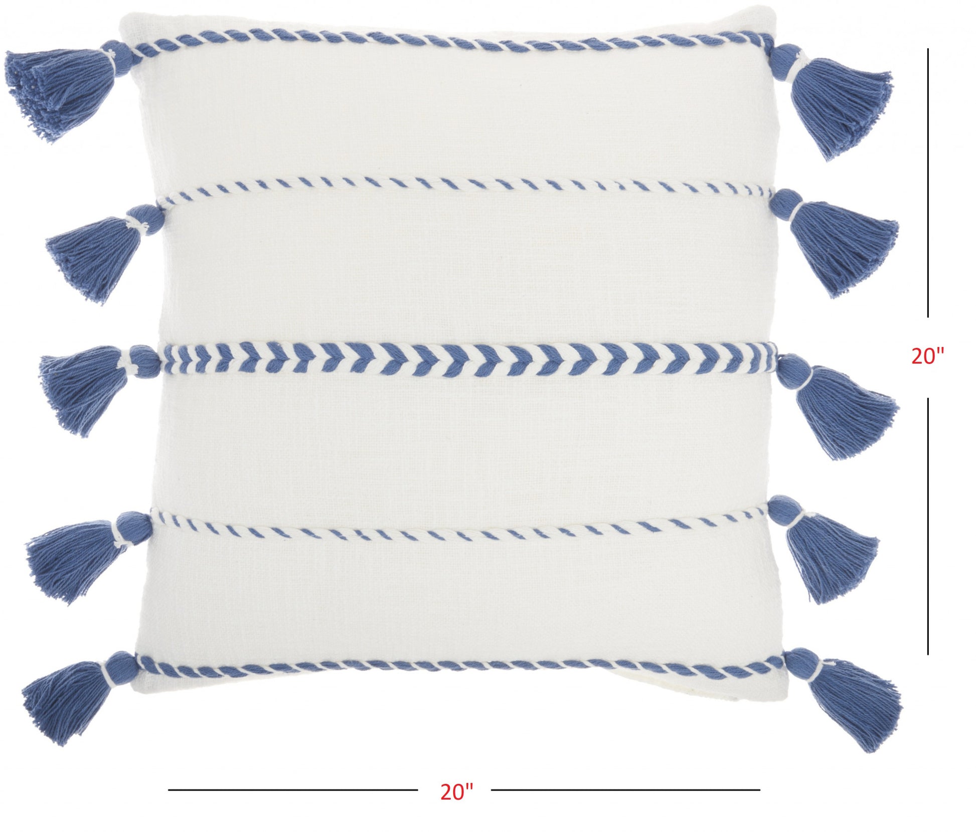 Contemporary and quirky, this Bohemian White Cotton Accent Pillow with Blue Tassel Details will help bring a Boho-chic style to your interior by offering plush comfort and easy decorating. This throw pillow is expertly handcrafted, making it a unique item that is made with skill and professionalism. The added feature of a zipper closure makes for easy cleaning of the pillow case, allowing for easy care. The pretty blue tassels on the four corners and the blue textured braided trellis pattern woven into the front cover adds a great detail and uniqueness to the design and your future pillow setup! 5" x 20" x20"