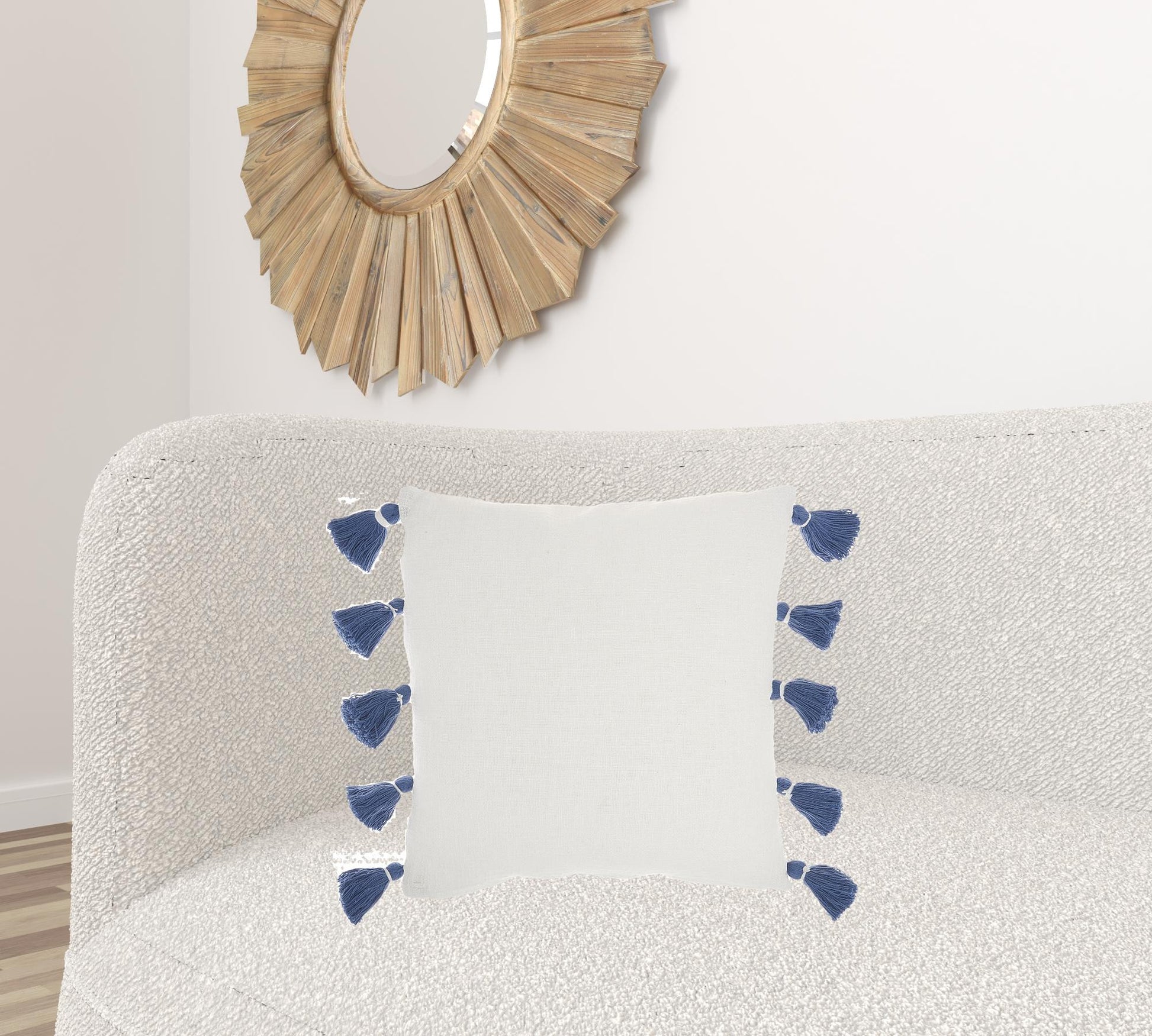 Bohemian White Cotton Accent Pillow With Blue Tassel Details