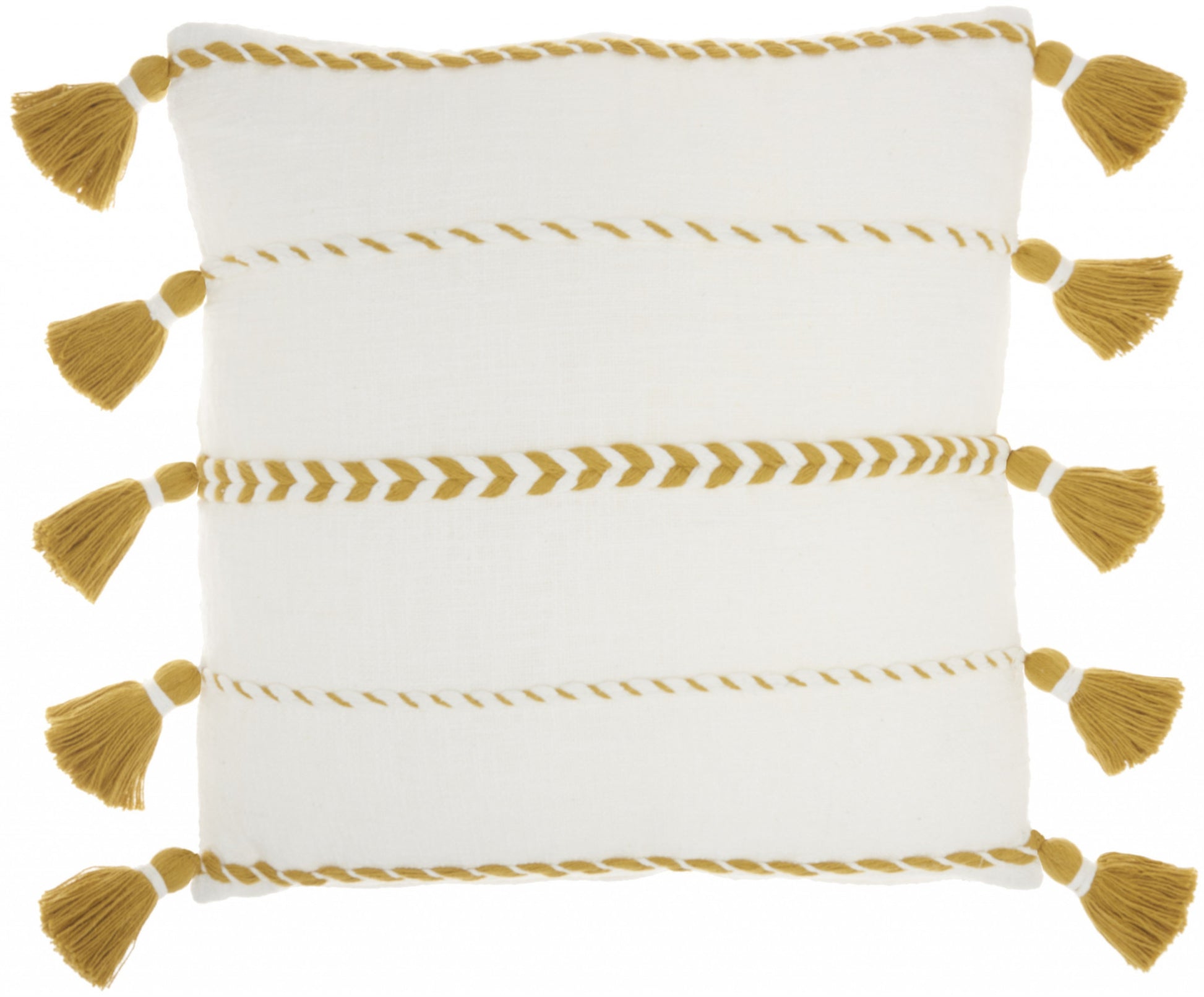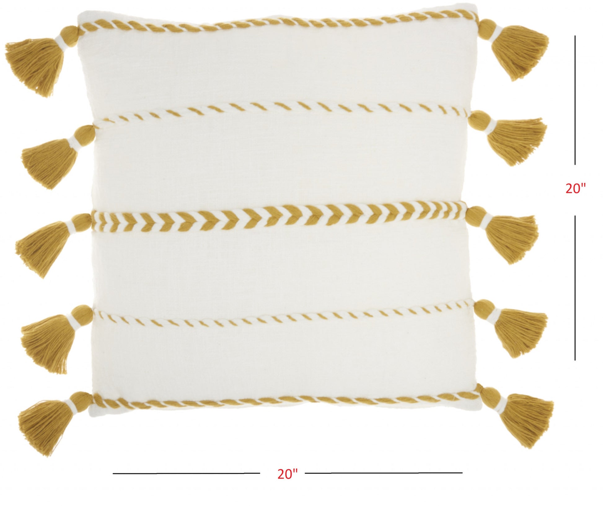 Contemporary and quirky, this Bohemian White Cotton Accent Pillow with Mustard Tassel Details will help bring a Boho-chic style to your interior by offering plush comfort and easy decorating. This throw pillow is expertly handcrafted, making it a unique item that is made with skill and professionalism. The added feature of a zipper closure makes for easy cleaning of the pillow case, allowing for easy care. The pretty mustard tassels on the four corners and the mustard textured braided trellis pattern woven into the front cover adds a great detail and uniqueness to the design and your future pillow setup! 5" x 20" x20"