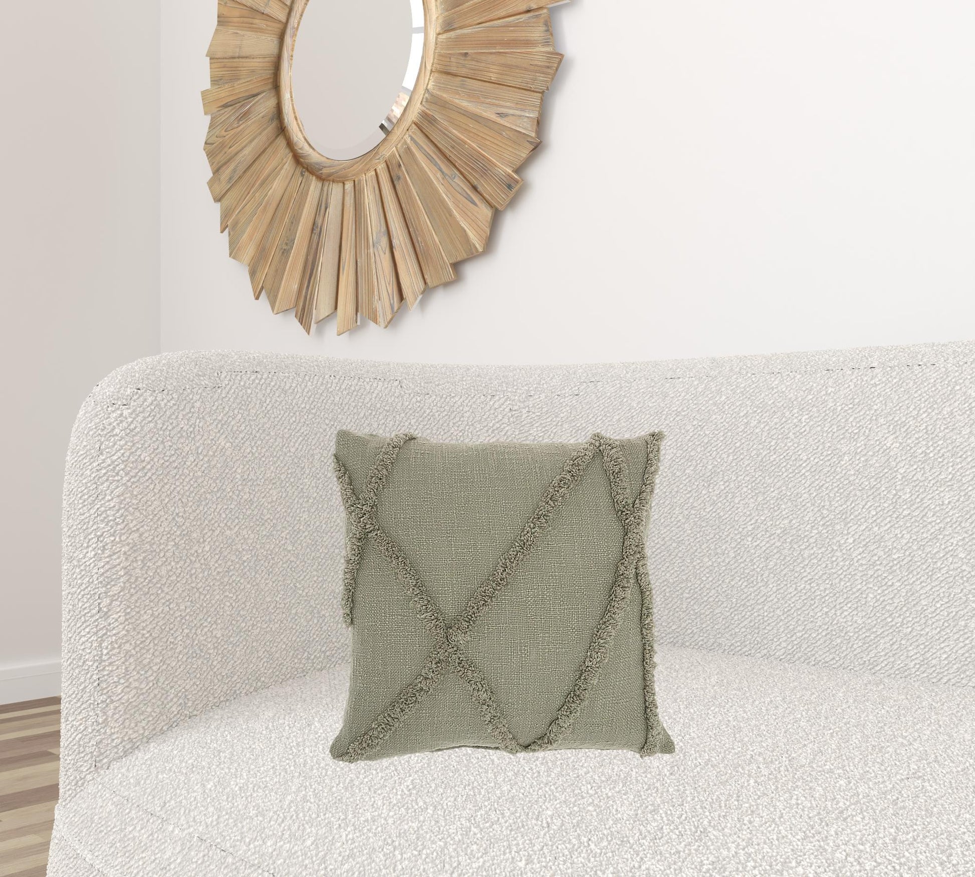 Impressing the viewer and holder with its soft-touch details, this Boho Chic Solid Sage Textured Lines Throw Pillow will engulf anyone holding it with an unearthing sense of comfort and relaxation. The textured lines are made to entice you and your guests with its high-quality material and playful design. Using 100% cotton fabric, the textured pattern is made to last without losing its original allure. The solid sage color works wonders with bright and neutral colors giving a hint of elegance while keeping all of your art pieces in the limelight. Complete your bohemian look while staying true to your creative self with this unique throw pillow. 18” x 18” x 5”