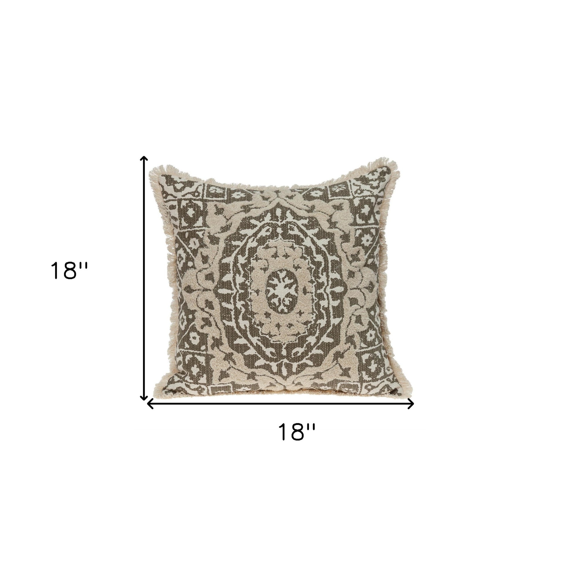 Bohemian in style with a hint of tribal thrown in, this Boho Garland Beige and Dark Brown Decorative Accent Pillow is a great way to bring good vibes softness into your space. This square accent pillow features a 100% cotton textured high and low detailing on the front in beige and a distressed dark brown decorative garland abstract floral design. Soft beige fringe finishes this cool pillow off on all four sides. Attractive and comfortable this decorative pillow is great for the bed, sofa, or your favorite chair. The solid backside includes a flap disguising a zipper for easy insertion/removal of the soft polyester filling. 18" x 18" x 4"
