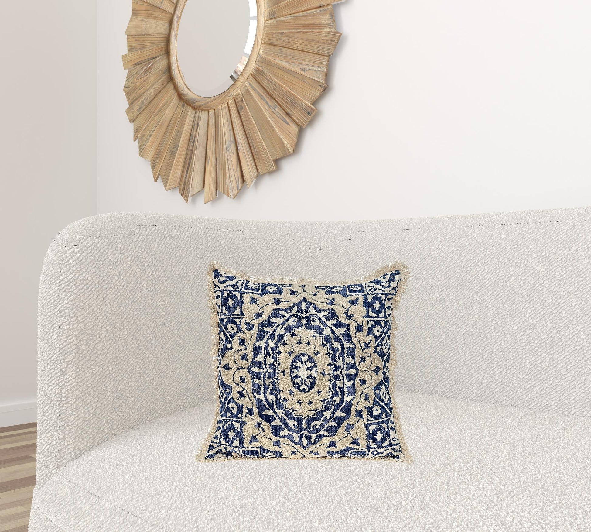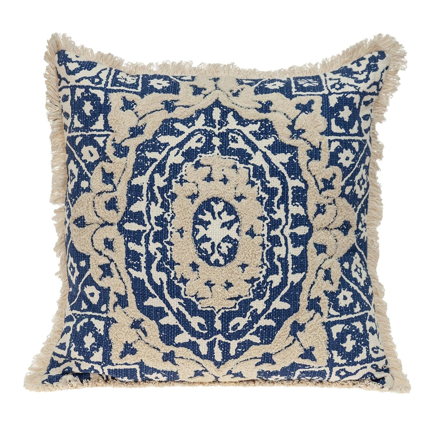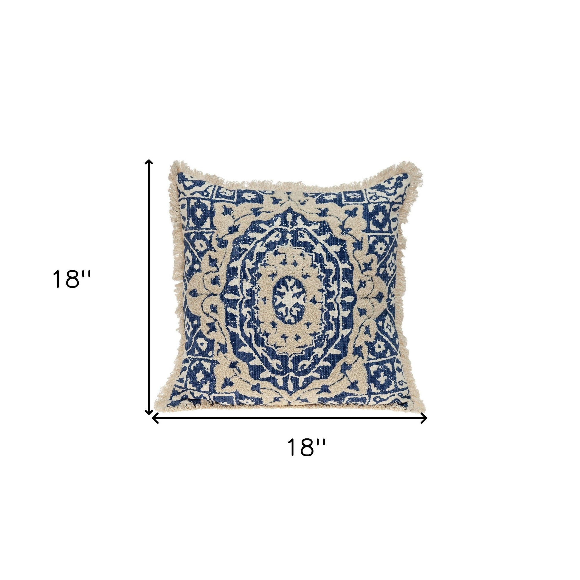 Bohemian in style with a hint of tribal thrown in, this Boho Garland Beige and Navy Blue Decorative Accent Pillow is a great way to bring good vibes softness into your space. This square accent pillow features a 100% cotton textured high and low detailing on the front in beige and a distressed navy blue decorative garland abstract floral design. Soft beige fringe finishes this cool pillow off on all four sides. Attractive and comfortable this decorative pillow is great for the bed, sofa, or your favorite chair. The solid backside includes a flap disguising a zipper for easy insertion/removal of the soft polyester filling. 18" x 18" x 4"