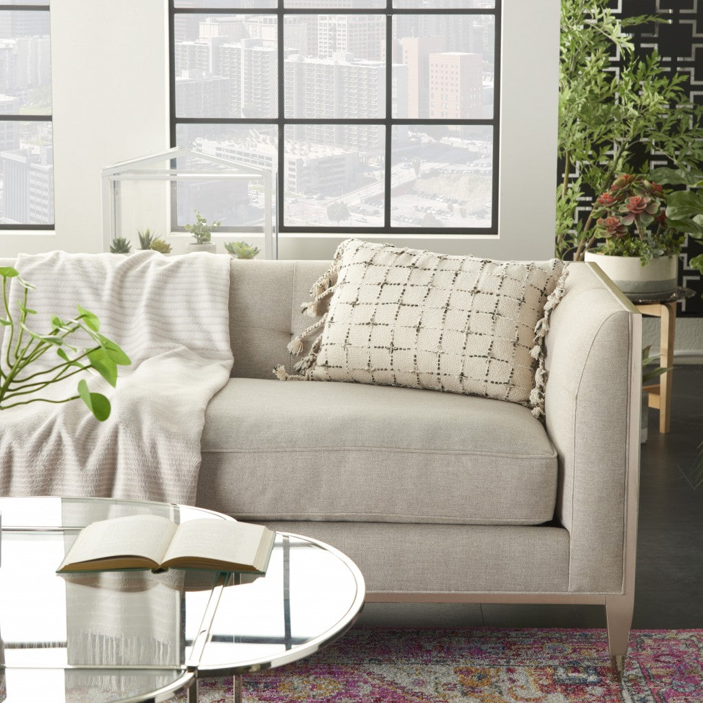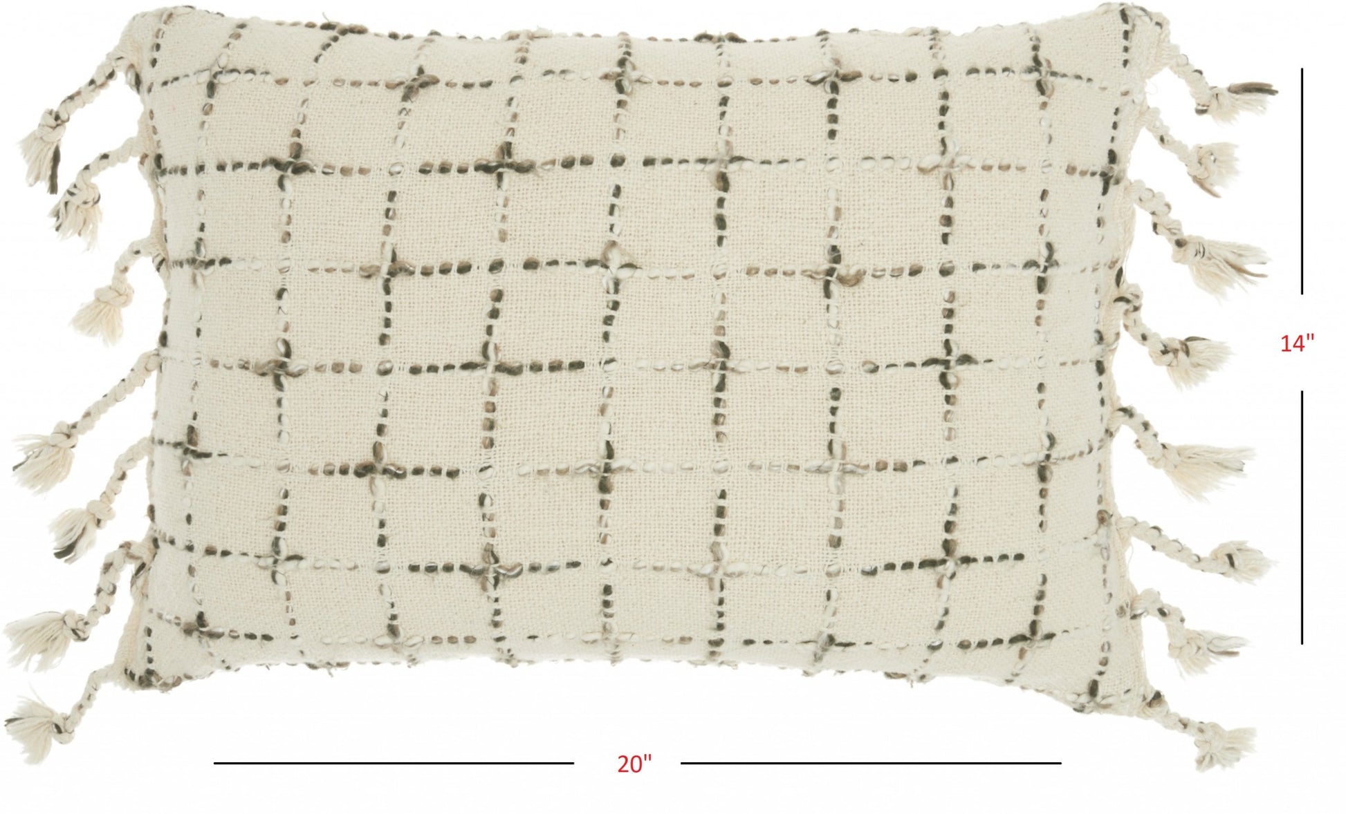 With this Brown and White Grid Detail Lumbar Pillow you can add a touch of natural design to your home without worrying about any clashing colors or design aesthetics. This pillow is covered in a soft and luxurious fabric which has a grid pattern on it. The grid pattern has small squares which are lined with slight swatches of different shades of brown. There is extra stitch detailing on the surface as well to add a textural element. The tassels on either side are braided and are made of threads that have the same white and brown colorway. A great way to have unmatched comfort and complete lumbar support, this pillow will look great on the bed, on the couch, or any chair you have in your home. 5" H x 14" W x 20" D