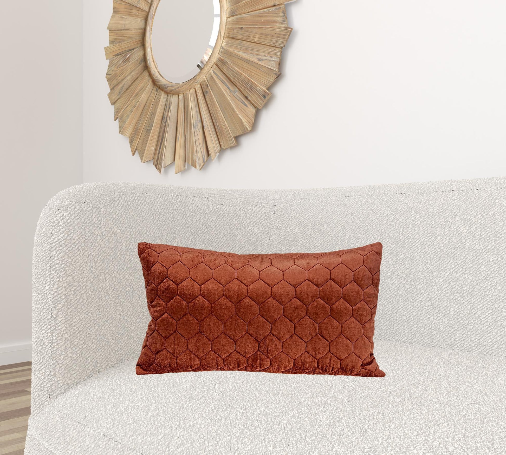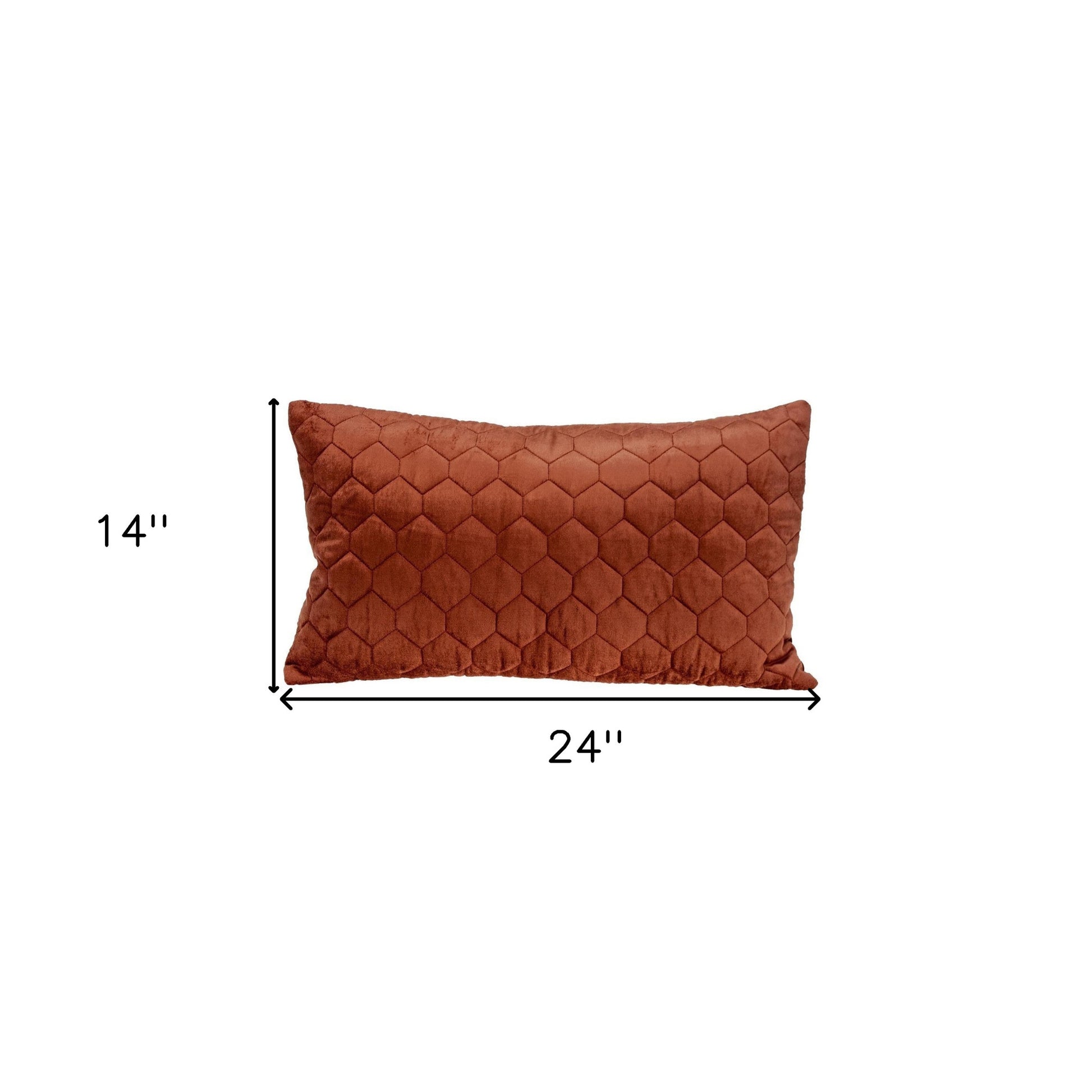 Add some artistry to your existing décor with the Burnt Orange Tufted Velvet Quilted Lumbar Throw Pillow. Crafted from a combination of soft cotton and velvet, the cushion has a rather cozy and lush exterior with a quilted geometric pattern that’s surrounds the frontal part of the pillow. It's lightweight nature makes it ideal to toss around from your favorite sofa to your extravagant bed. A hidden flap creatively conceals a zipper provided for easy removal and insertion. Enhance your interior by binging a little character to your home with this functional and luxuriously styled throw pillow. 14" x 24" x 4"