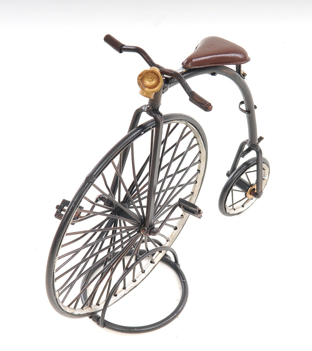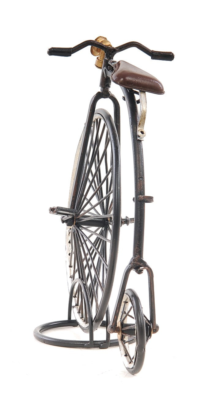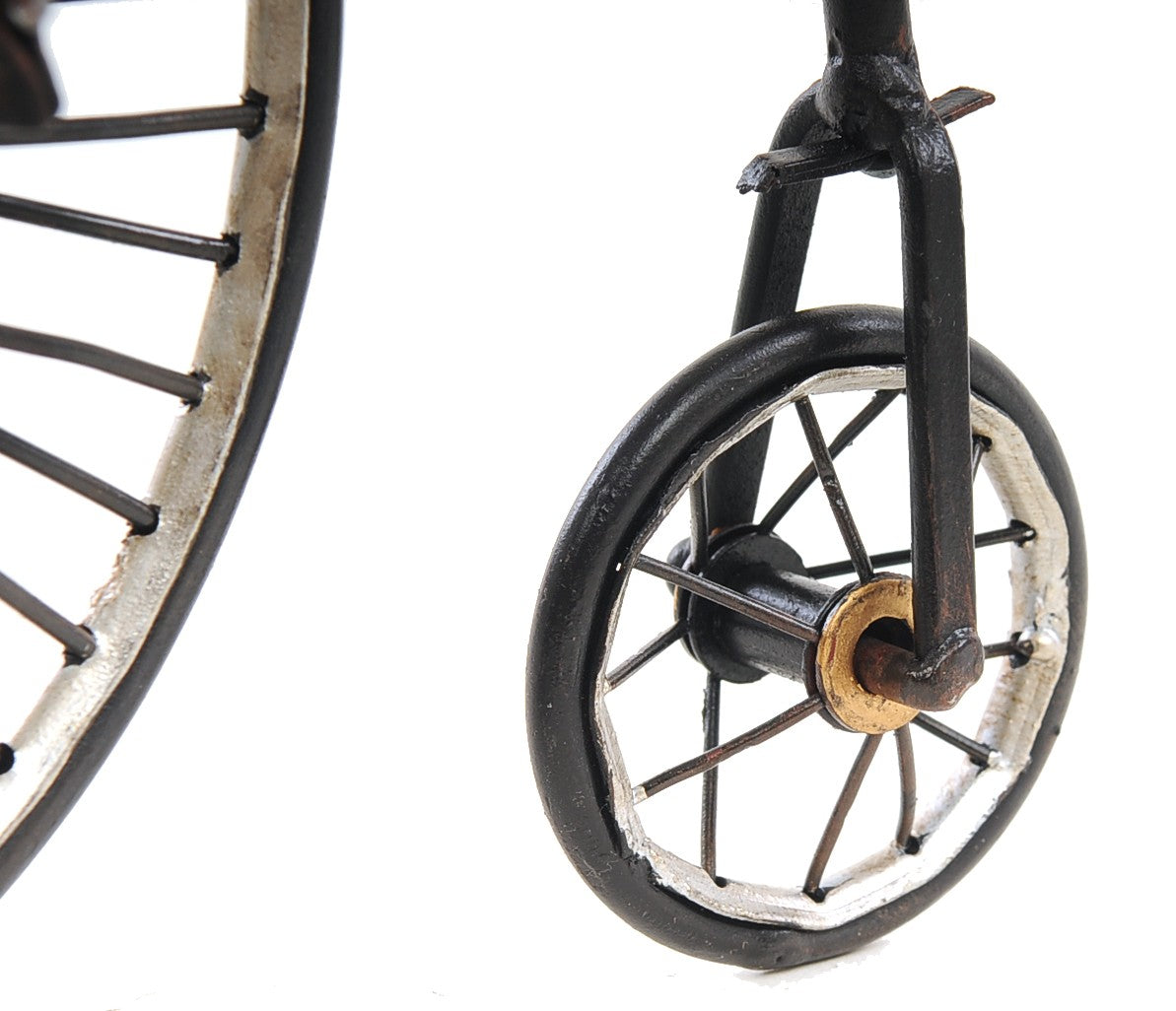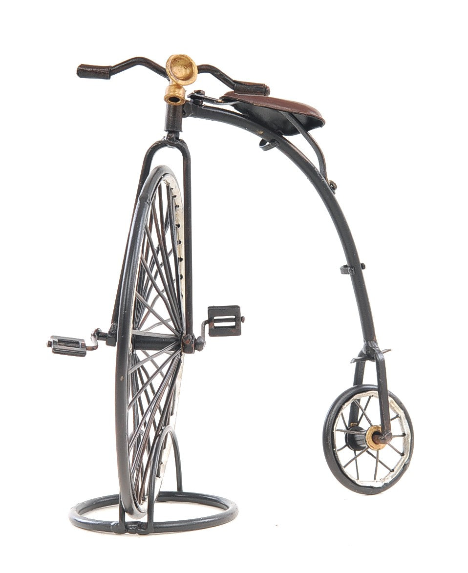 Spark up your library or living room with this c1870 High Wheeler Bicycle Sculpture. This unique vintage bicyle model is a piece of art that features authentic and intricate details inclduing iron spoke wheels, seat, light weight frame, and pedals. Accent your shelves with this fashionable and historic looking replica today. 8.5" x 9.5" x 3.5"