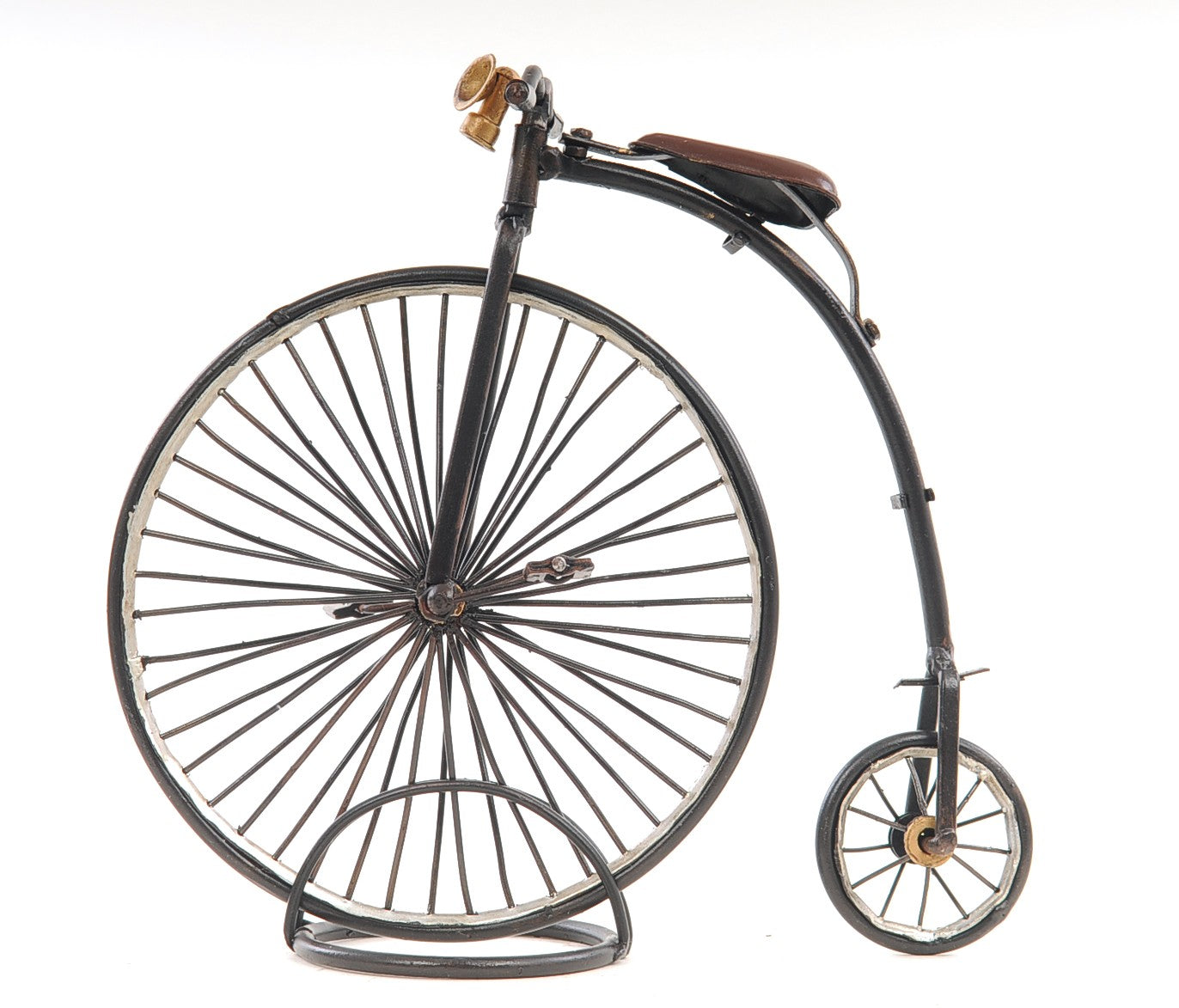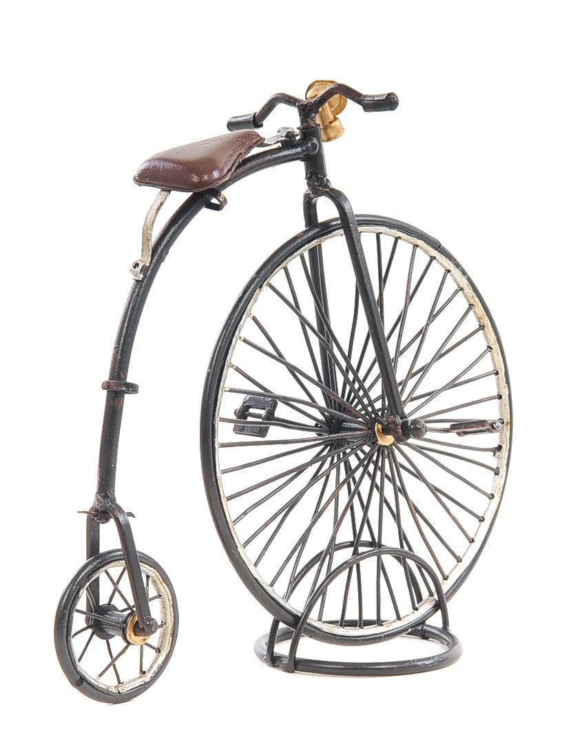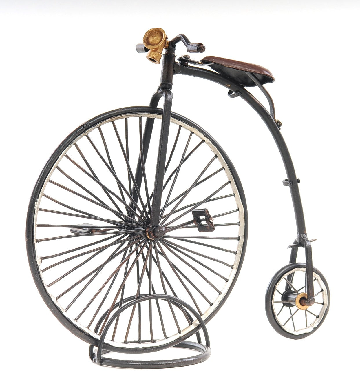 Spark up your library or living room with this c1870 High Wheeler Bicycle Sculpture. This unique vintage bicyle model is a piece of art that features authentic and intricate details inclduing iron spoke wheels, seat, light weight frame, and pedals. Accent your shelves with this fashionable and historic looking replica today. 8.5" x 9.5" x 3.5"