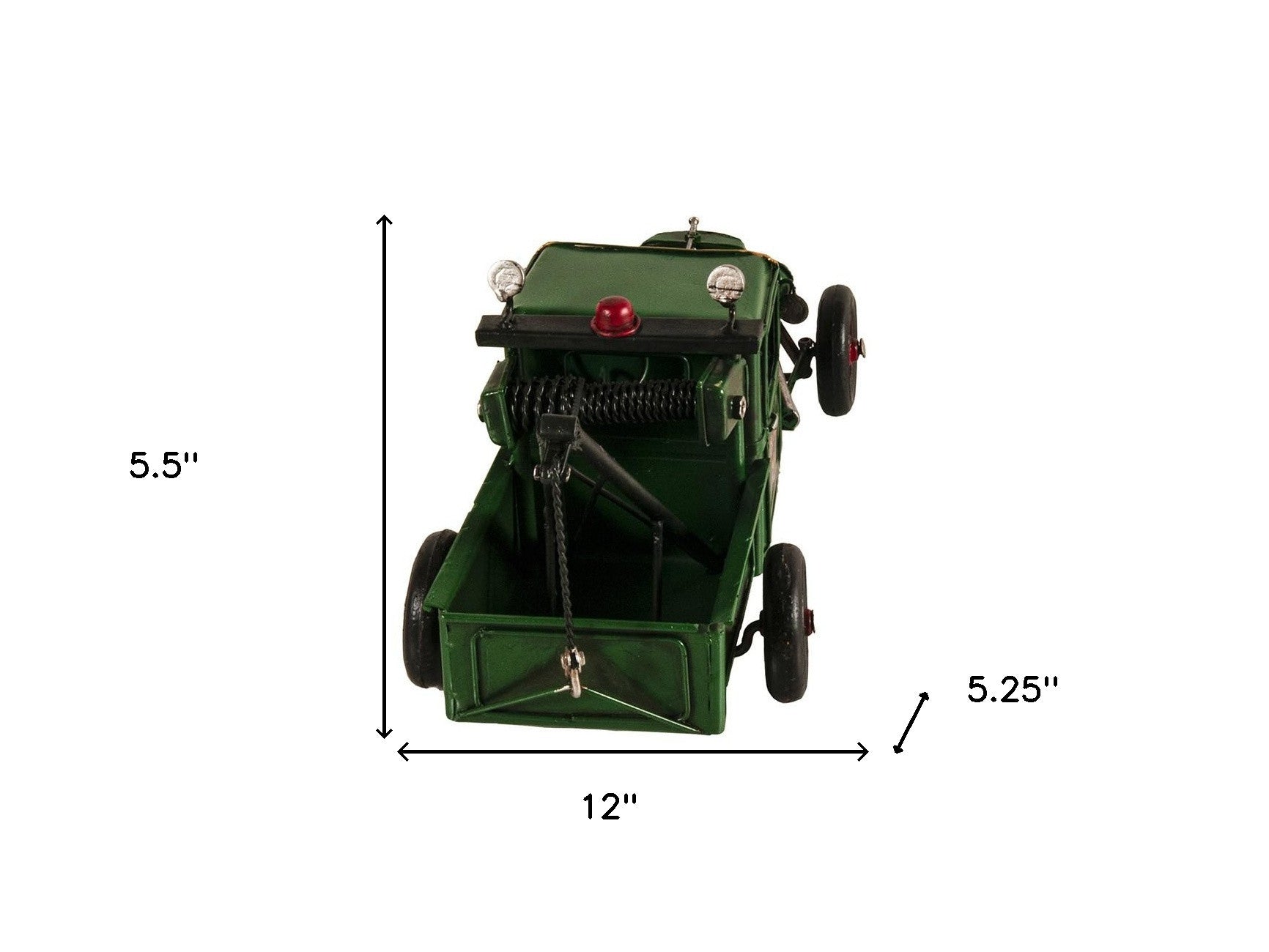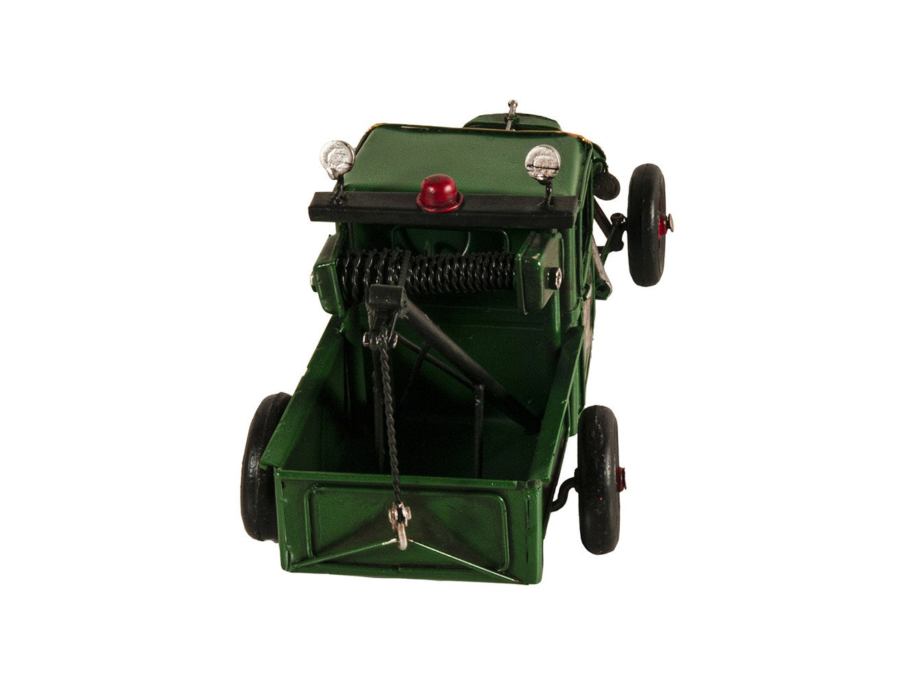 Authentic and super detailed, the c1918 Tow Truck Sculpture is a unique handmade replica of the very first tow truck. It was handmade by a master craftsman in 100% metal and features unique details. It features many details as rolling wheels, a naked engine, a crane system, and chains. Painted in vintage green, it is a great display piece and a sought-after piece for automobile enthusiasts. 5.25'' x 12'' x 5.5"