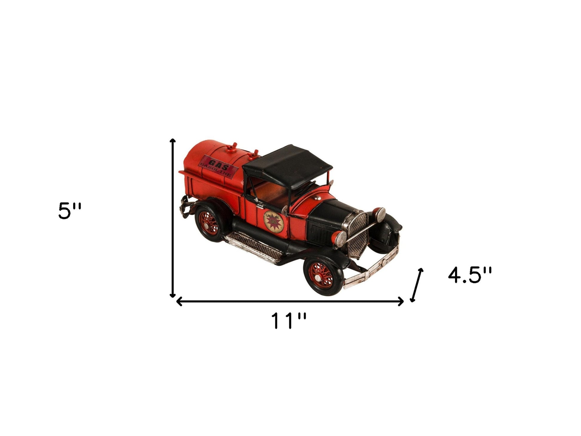An authentic replica of one of the most iconic trucks of all time, the c1930 Ford AA Fuel Tanker Sculpture is a handmade metal replica of this truck outfitted as a fuel tanker. Handcrafted from metal, painted in a black and red combination, and meticulously detailed, this model features rolling wheels, headlights, turn signals, a steering wheel, fenders, and a fuel tank in the back. It is a great conversation starter and an excellent piece for any vintage car collection. 4.5'' x 11'' x 5"