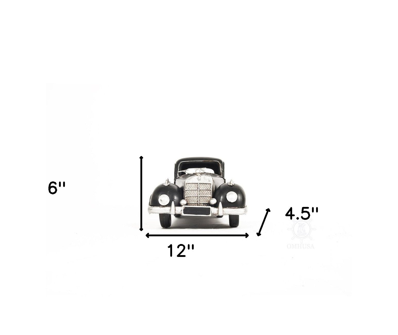 An authentic replica of one of the most iconic cars of the 1930s, the c1937 Plymouth P4 Deluxe Black Sculpture is a sought-after model for all collectors and automobile enthusiasts. Handcrafted from metal, painted in the classic black, and meticulously detailed, this model features rolling wheels, headlights, turn signals, a steering wheel, and the distinctive big fenders of the era. It is a great conversation starter and an excellent piece for any vintage car collection. 4.5" x 12" x 6"
