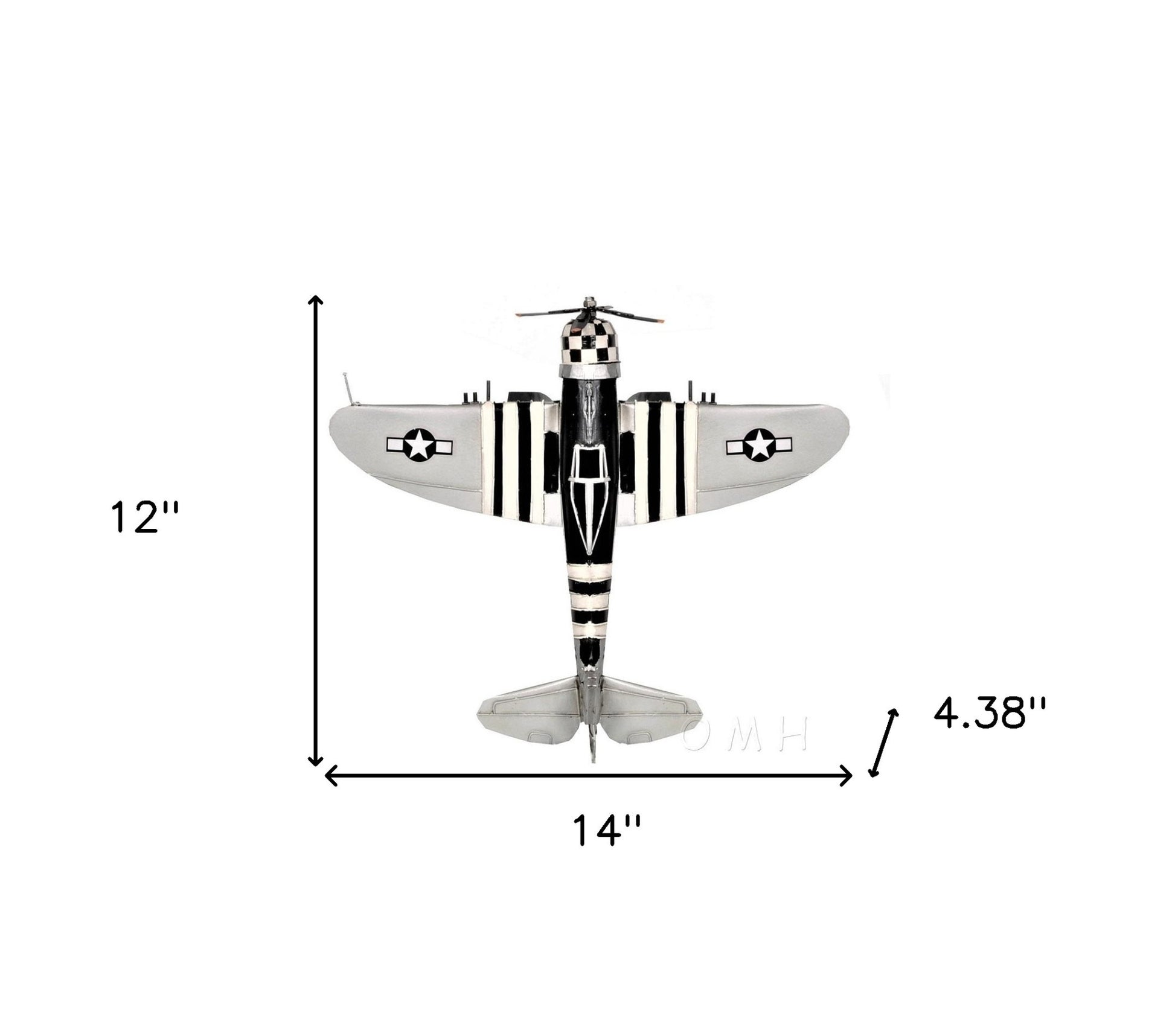 A beautiful replica of the iconic WWII American Army bomber-fighter, the c1943 Republic P-47 Thunderbolt Sculpture is handmade out of metal and accurately detailed. It comes with remarkable details such as landing wheels, a cockpit, a rotating propeller and is painted with authentic WWII paint and symbols. It is a sought-after piece for aviation and WWII enthusiasts. 4.37" x 12" x 14"