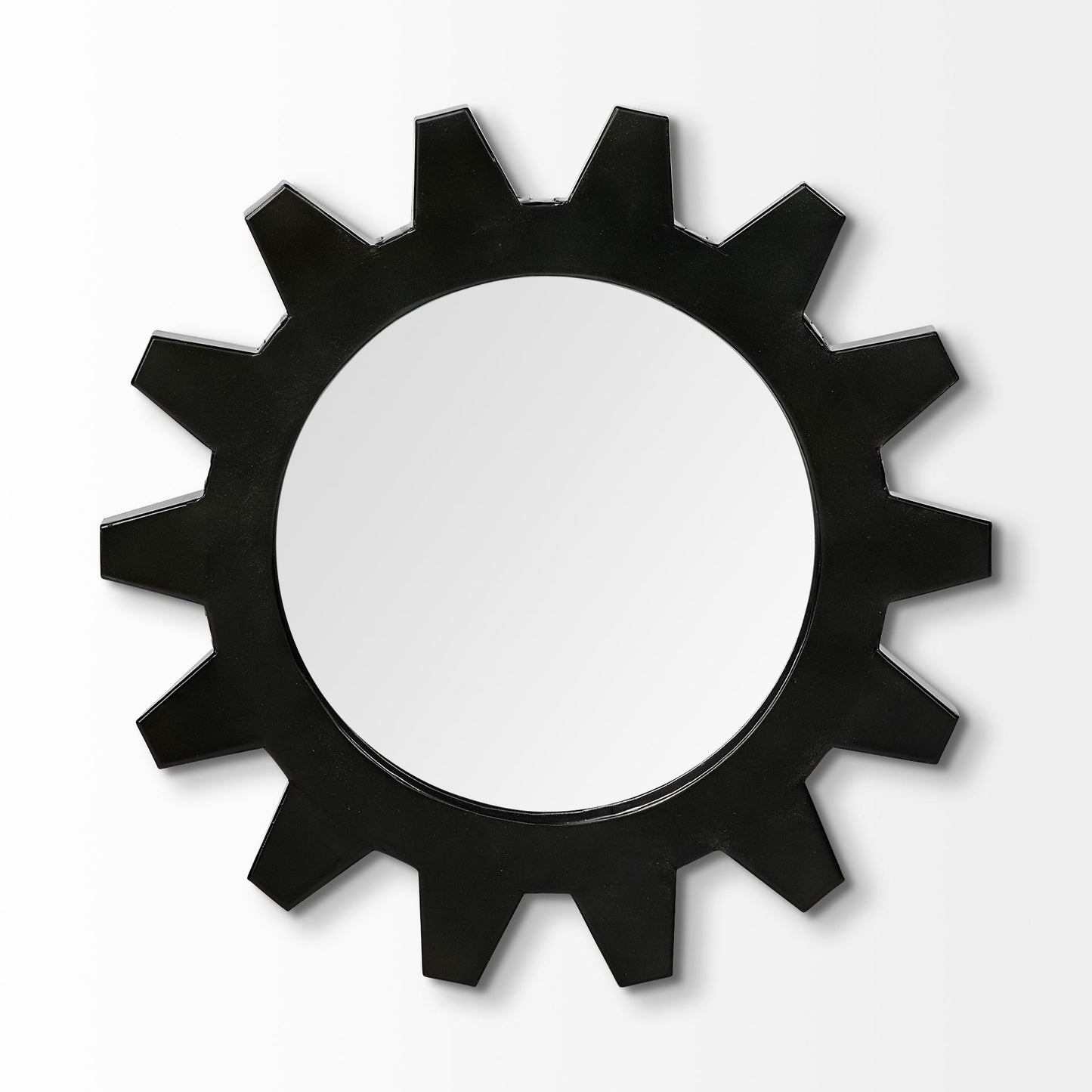 This contemporary COG 17" Round Black Metal Frame Wall Mirror is crafted to resemble an old world industrial cog, making this a unique and noticeable variation to your space. Great to be used alone or group together with other mirrors or wall art to make your space a customized version of perfection. Dimensions: 16.92" x 16.92" x 1.96". Weights 5.5 lbs