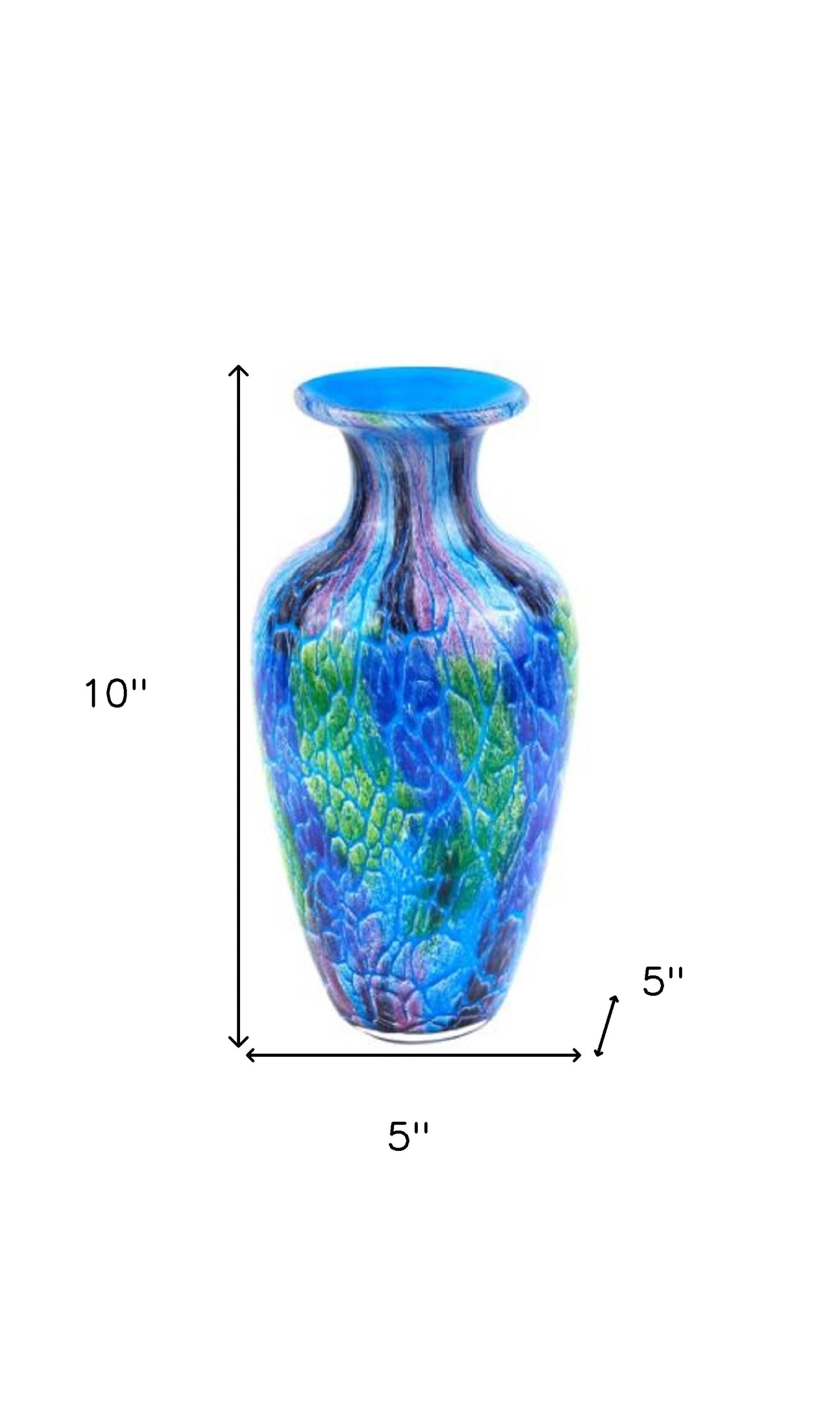 With or without flowers this Contemporary Multi-color Mouth Blown Art Glass Vase is a piece of art. It has a beautiful design that will complement the setting of your home. Its abstract pattern in multi colors of blue, green, and pink makes the vase attractive and pleasant to utilize. 10" (H) x 5" (W) x 5" (D).