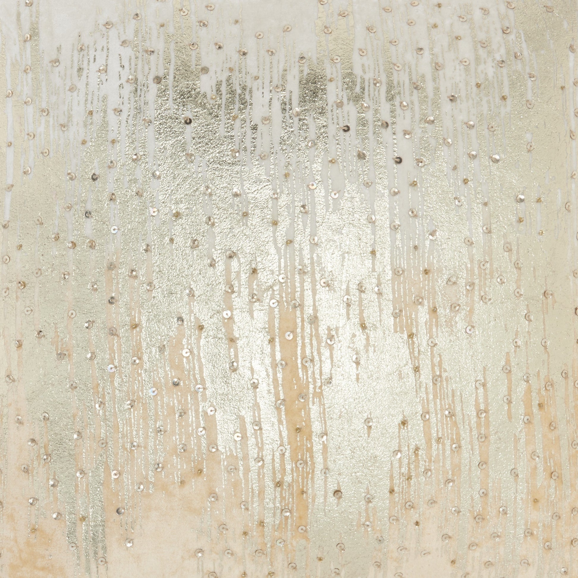 This Cream Sequined Ombre Throw Pillow will help you elevate the look of any seating space in your home with its unique design and stunning color palette. This square shaped pillow is covered in a soft cream colored fabric which serves as the perfect background for the details on top. The ombre effect comes from the white and gold foil colors that have a drip pattern to them and contrast very nicely with the cream background. On top of all of this there are gold colored sequins scattered around the whole front of this throw pillow. There is also thin cream colored edging around the whole perimeter. This throw pillow will look great on your bed or your couch as everyday decor or you can use it to dress up a chair for formal occasions as well. 5" H x 18" W x 18" D