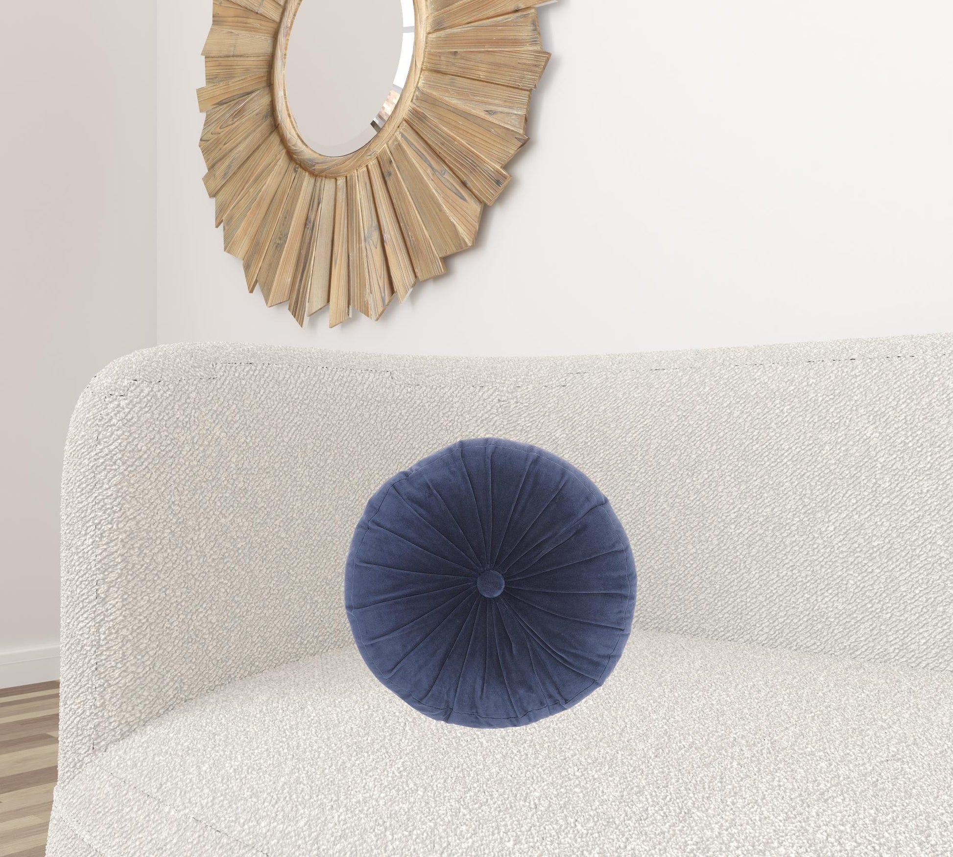 This Dark Blue Tufted Round Throw Pillow is the perfect way to add some unique design and comfort to your home. This pillow has a round shape and is covered in a stunning dark blue colored fabric. This fabric has a very soft and velvety feel to it which adds to the comfort that this throw pillow provides. This pillow has tufting in the middle which gives it the pleated look and is completed by a dark blue colored button holding it all together. This round throw pillow will add a nice depth to any pillow decor you have on your bed, on your couch or can be used as a stand alone pillow on your favorite chair as well. 5" H x 16" W x 16" D