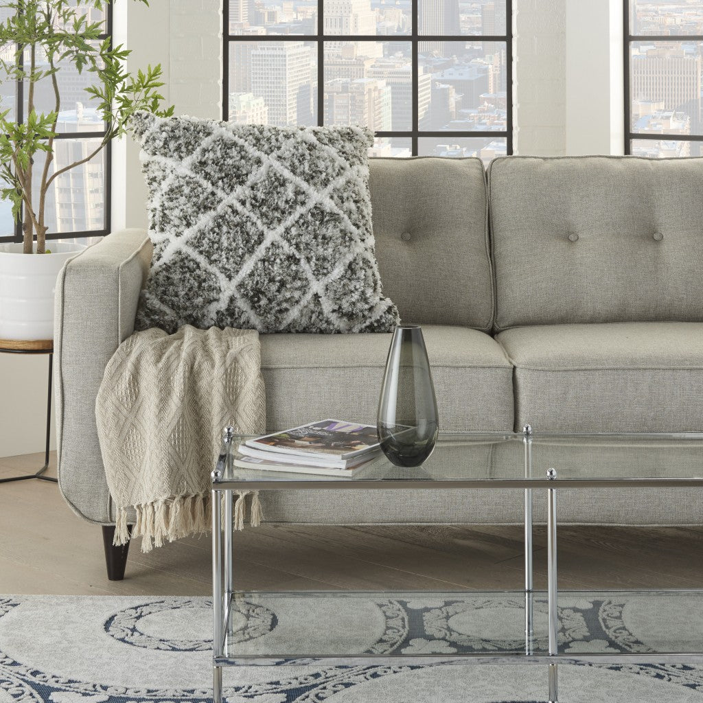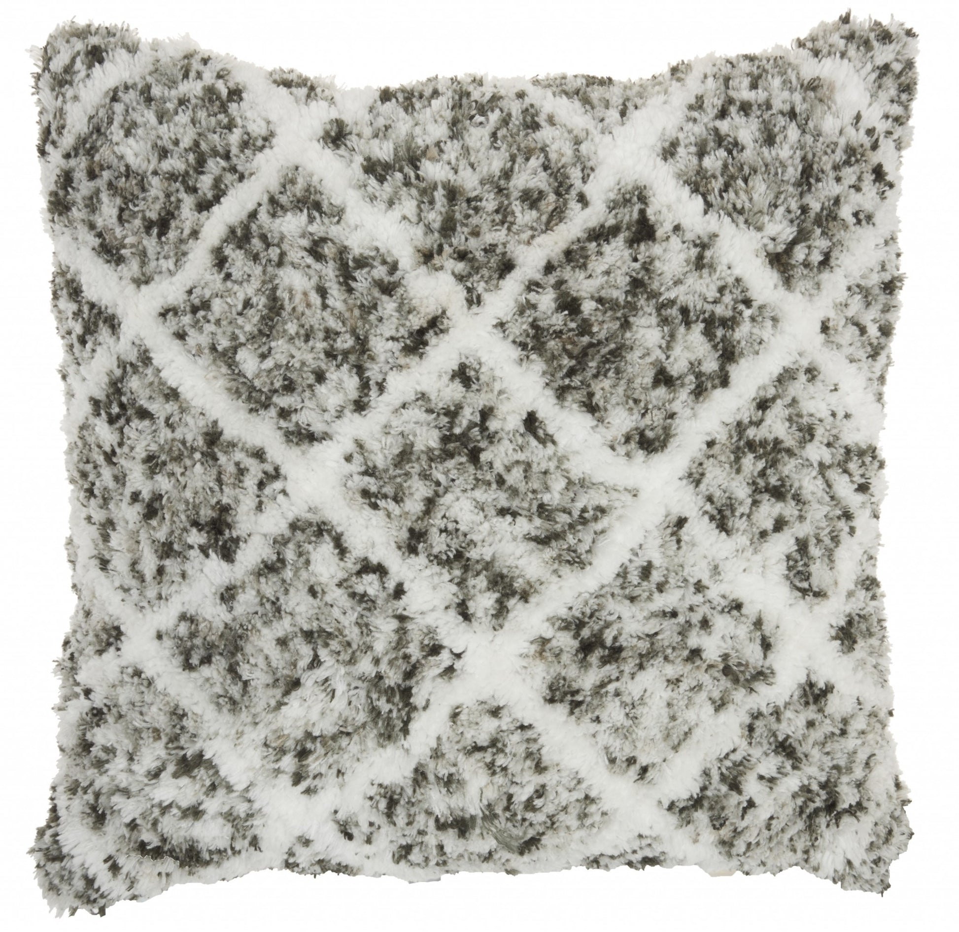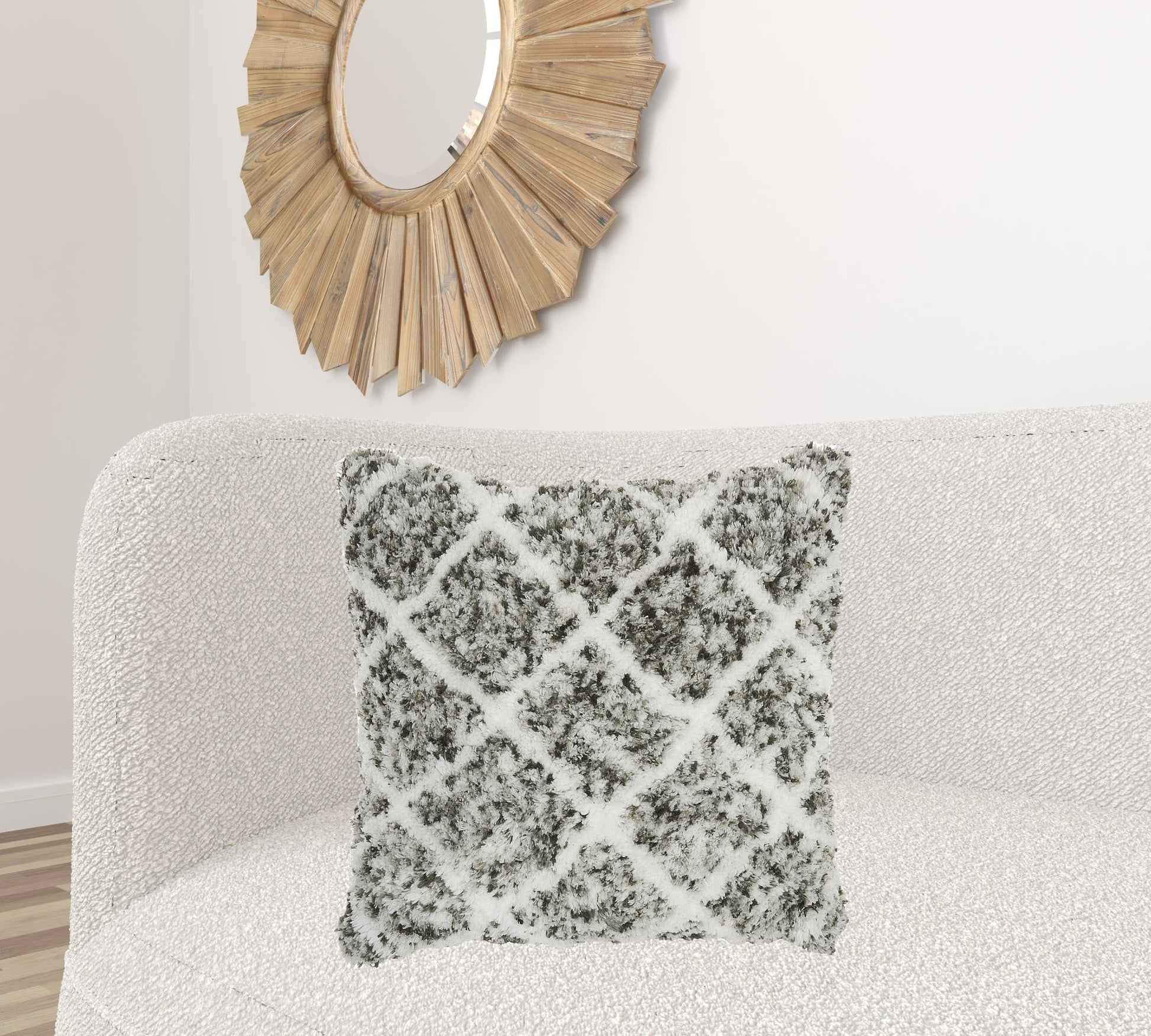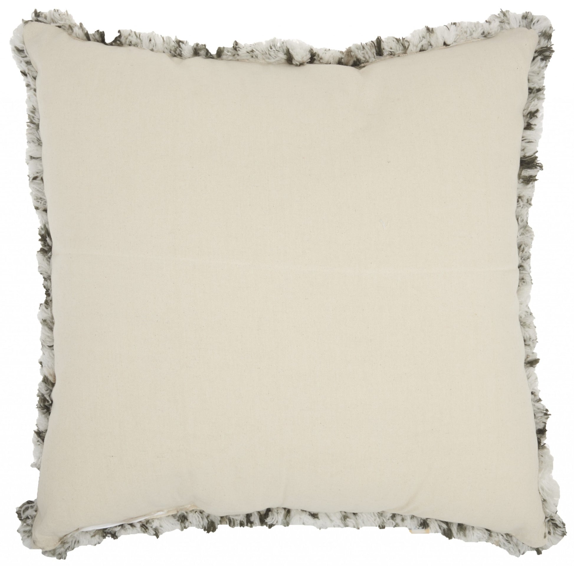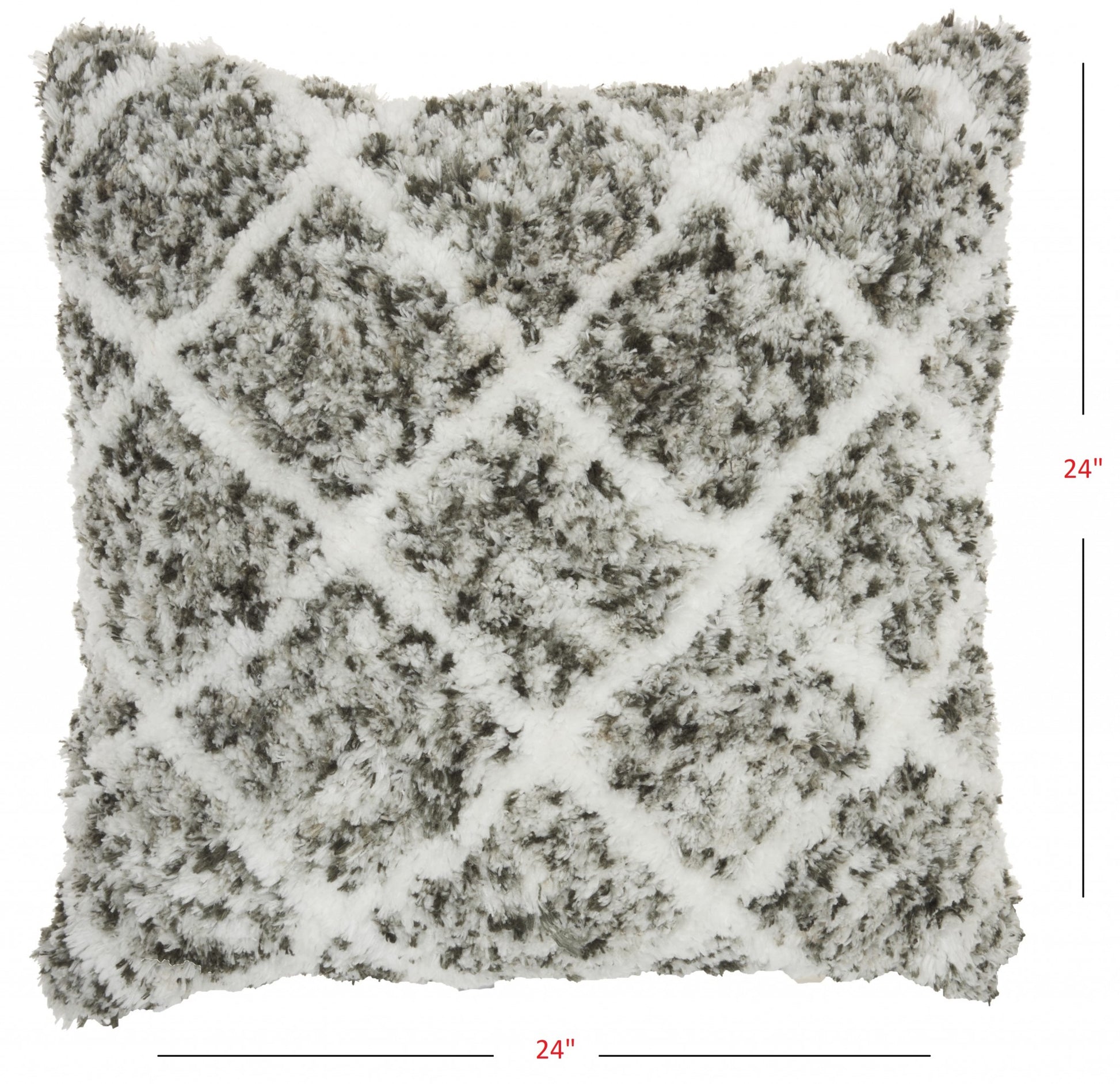 Bring in a touch of shabby chic design to your seating spaces with this Dark Gray and White Shaggy Chevron Throw Pillow which combined comfort and style beautifully. The pillow is covered in a shaggy fabric that has a dark gray and white colorway. On top of this background there is a white colored chevron pattern. The comfortable fabric covered a polyester filling which completes the feeling of luxurious coziness no matter where this pillow is placed. Use it in your bedroom, on your couch, or your favorite chair. 5" H x 24" W x 24" D