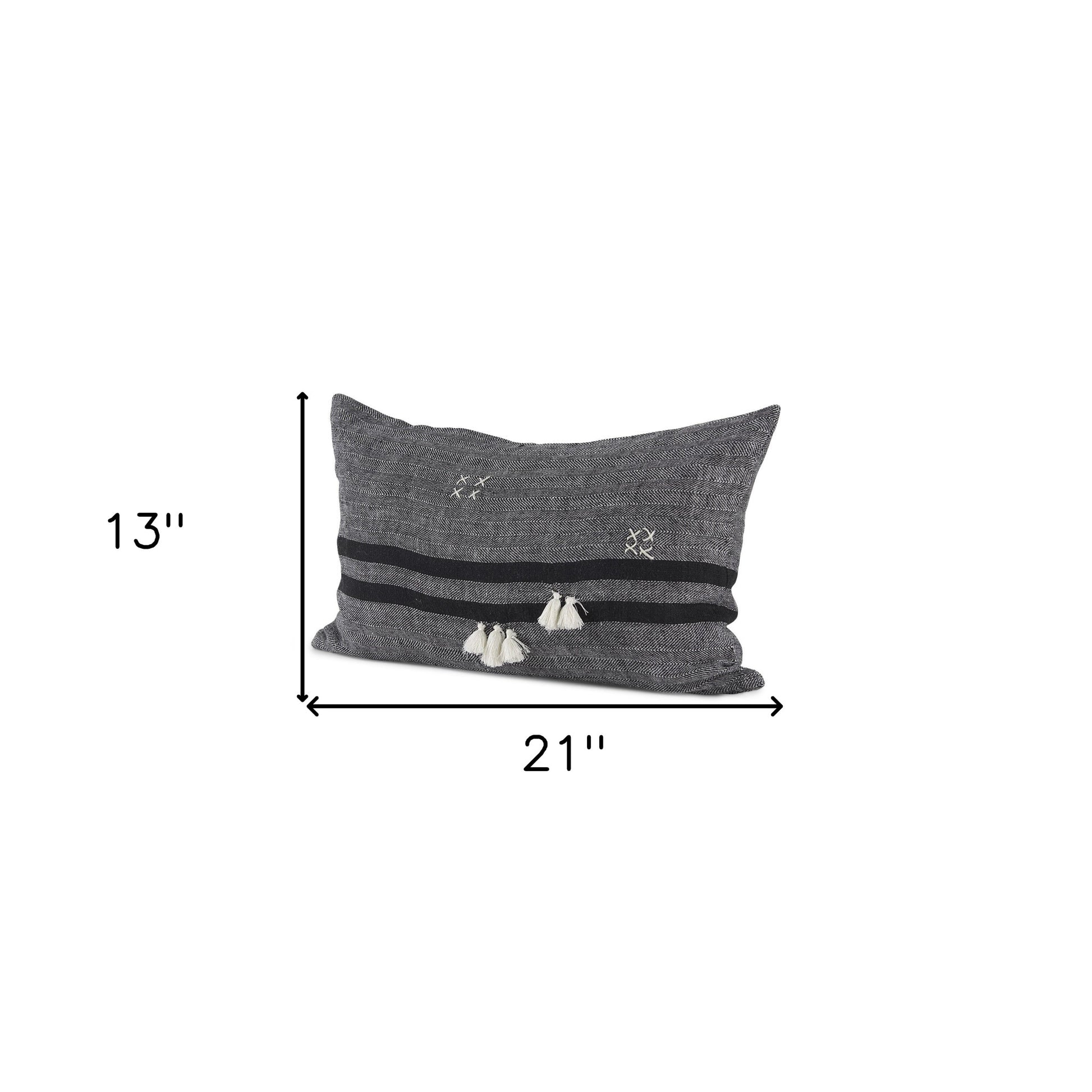 With this Dark Gray Detailed Lumbar Throw Pillow Cover you can add the perfect finishing touch to your couch. This Throw Pillow Cover is made highly durable and soft linen material that provides comfort beyond measure. The dark gray background of this Throw Pillow Cover has a stonewash feel to it. There are two black stripes running through the lower third of this cover which have white tassel details on top. There are also white stitched detailing around the front of the cushion which adds depth and texture. The back has a zip closure that ensures your cushion stays in there securely. You can easily clean and wash this Throw Pillow Cover without any damage or fading of the colors. The neutral color palette will look great on top of any couch, bed or chair you have and go with any interior style you have in your home. This Throw Pillow Cover is also great for extra back support. 13" H x 21" W x 1" D