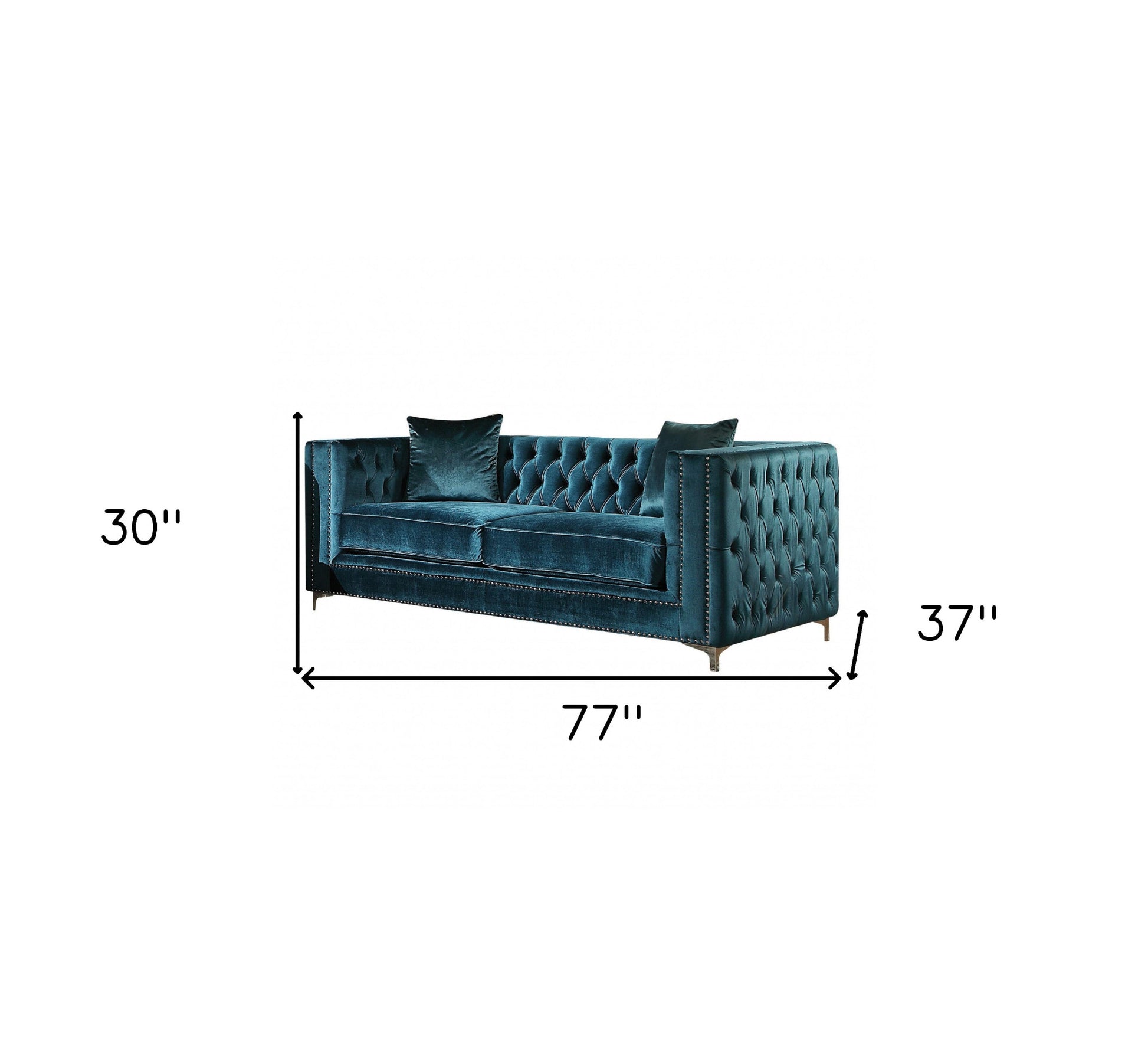 Elegant and eye-catching, the stunning loveseat is the perfect addition to any space. Rich dark teal velvet covers the plush. The comfortable seat is padded with high-density foam and has modern tufted design on the back and sides. Strength and beauty is guaranteed with a wood frame and sliver stainless steel legs. Two pillows are included for extra support. The nailhead trim that outlines the front edge of this beautiful piece to add an extra element of elegance. Fully assembled.